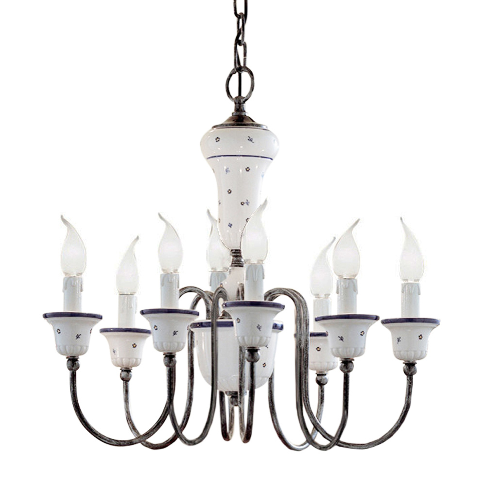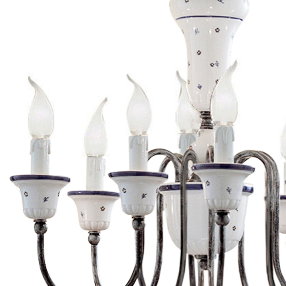 Handgefertigter 8-flammiger Kronleuchter aus Messing und handbemalter Keramik, hergestellt in Italien von Ferroluce.