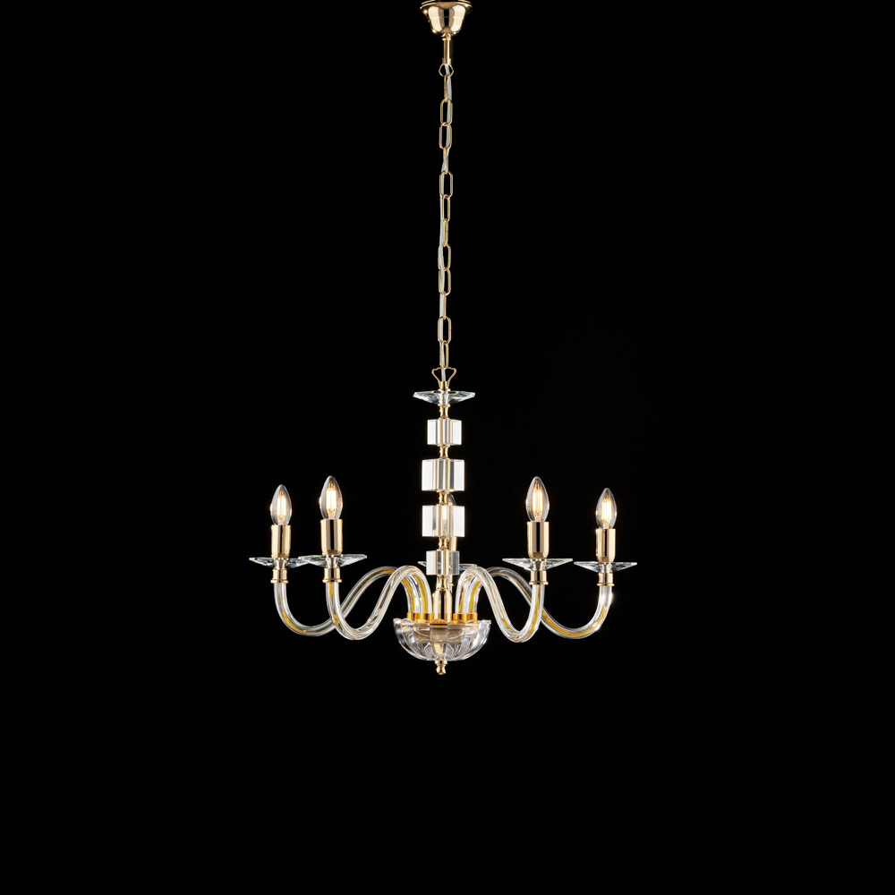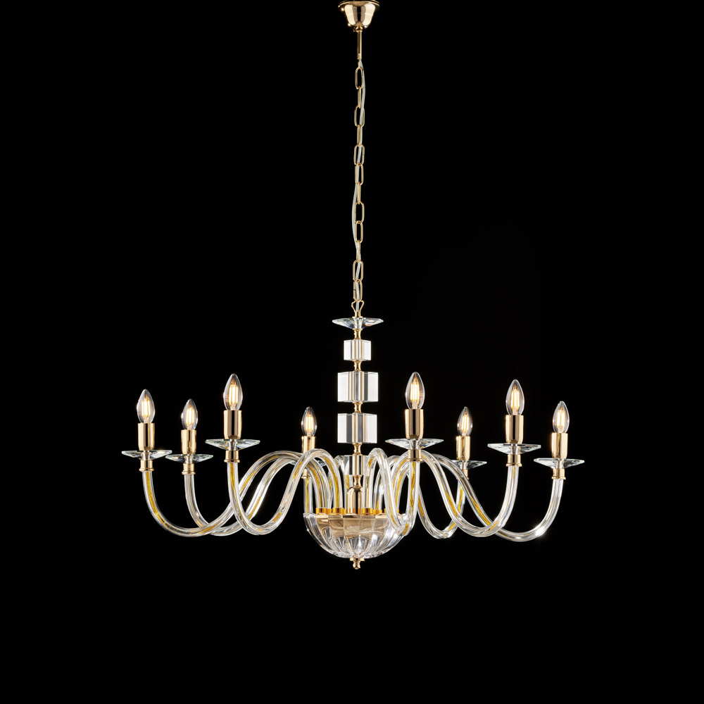 Dramatisch und exquisit raffiniert präsentiert sich dieser luxuriöse Goldleuchter mit Klarglas und Strasssteinen als ein äußerst prestigeträchtiges Lichtobjekt, das jedem Raum zeitlose Eleganz verleiht. Die klassische Form mit geschwungenen, kerzenförmigen Armen wird durch Klarglaselemente und Strassdetails veredelt, die das Licht vervielfachen und brillante, raffinierte Reflexionen erzeugen.