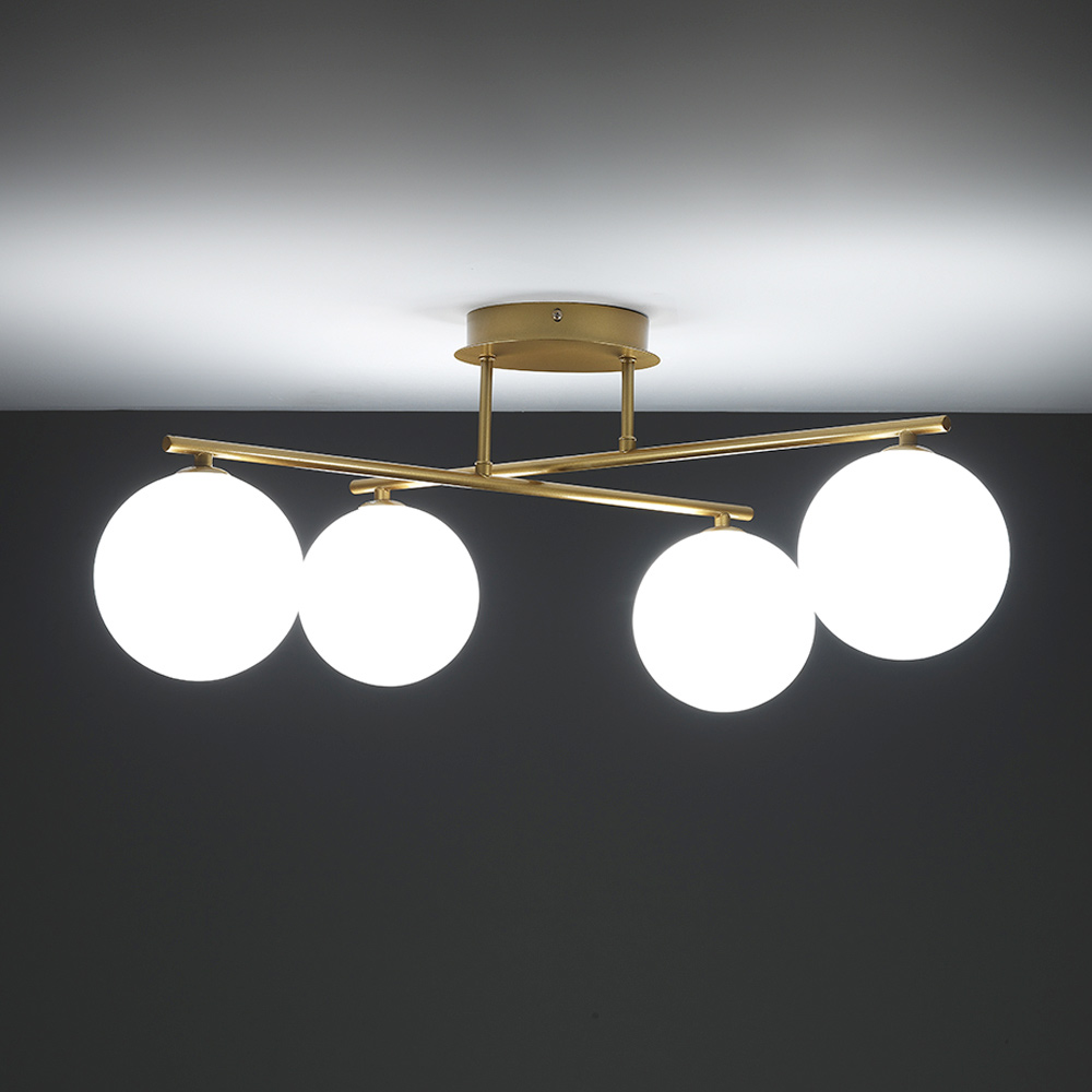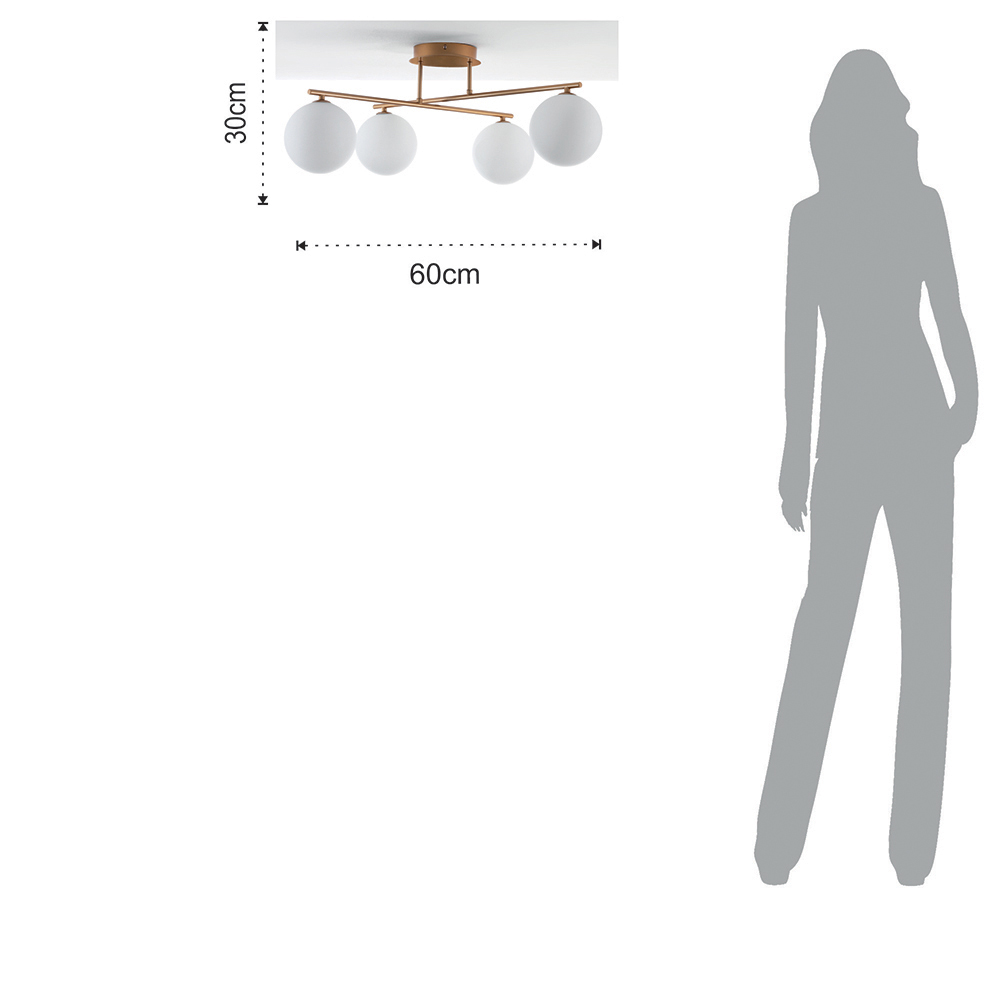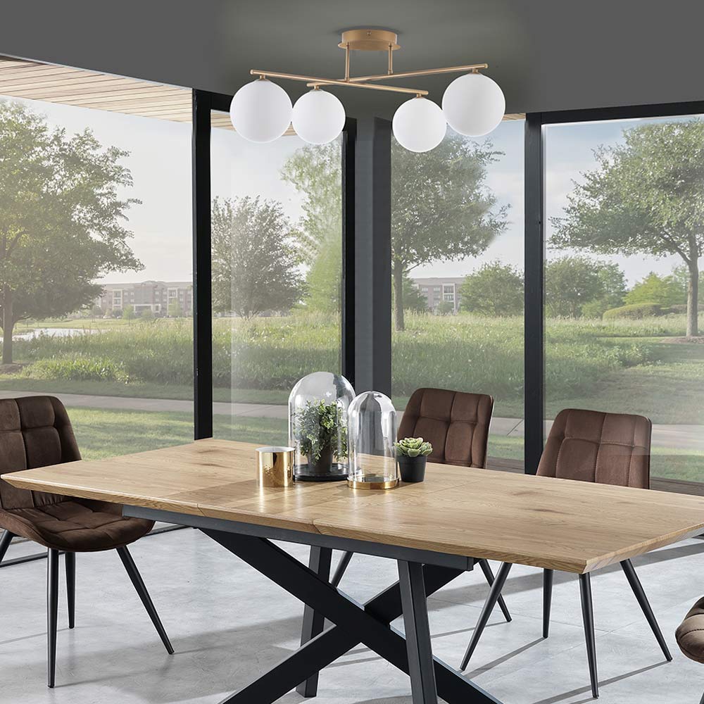 Dieser Kronleuchter ist ein hervorragendes Beispiel für elegantes und modernes Design und eignet sich ideal, um jeder Umgebung einen Hauch von Stil und Raffinesse zu verleihen. Mit vier undurchsichtigen Glaskugeln, die an einer Metallstruktur aufgehängt sind, erzeugt dieser Kronleuchter eine diffuse und angenehme Beleuchtung, perfekt für Umgebungen wie das Esszimmer, das Wohnzimmer oder sogar eine Eingangshalle.