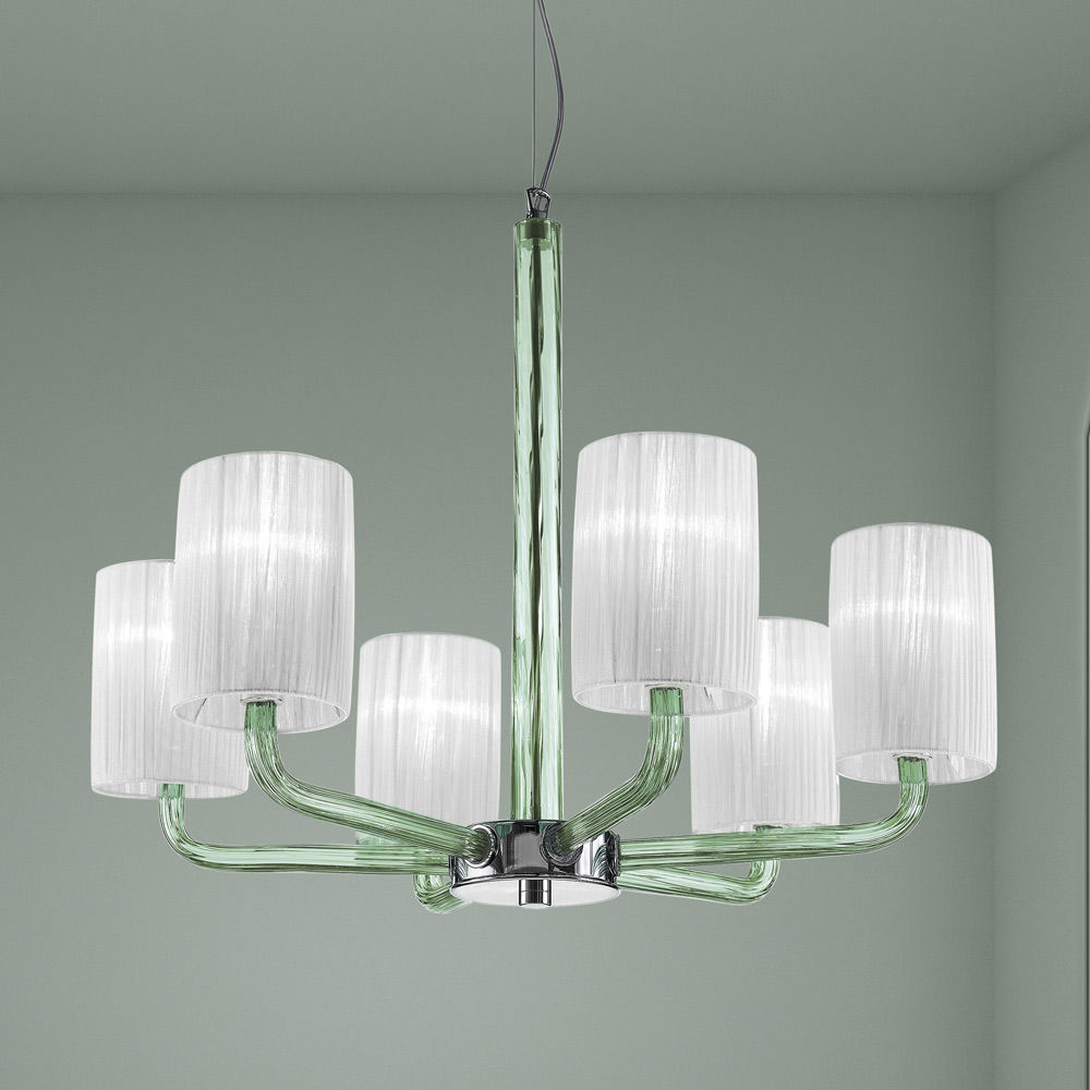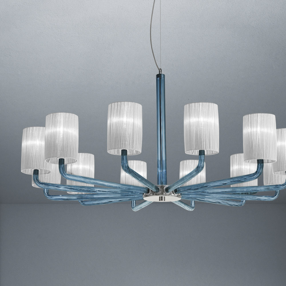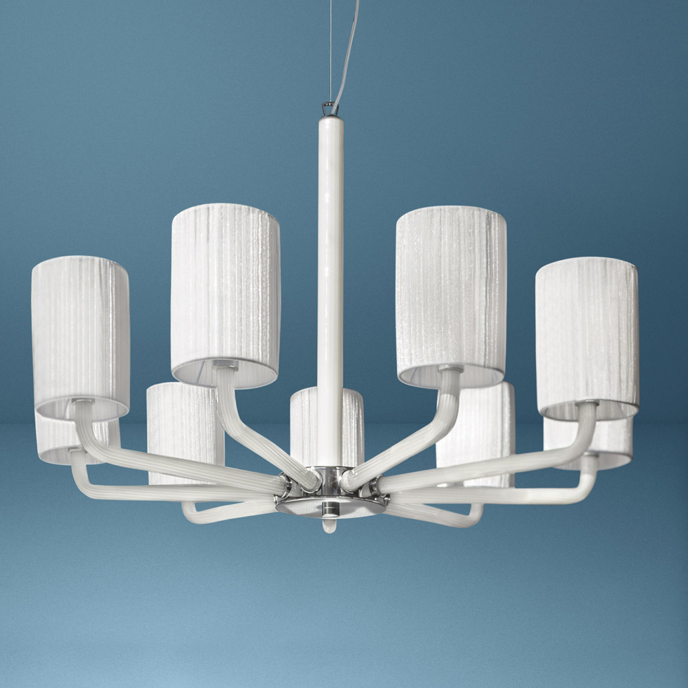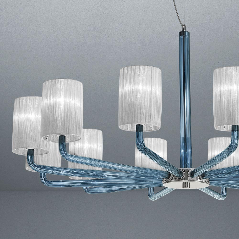 In Italien handgefertigter Kronleuchter aus venezianischem Glas mit Metalldetails in glänzendem Chrom-Finish und Lampenschirmen aus Stoff . Ein Möbelstück, das sich durch ein artikuliertes, aber essentielles Design auszeichnet und dank seiner starken Bühnenpräsenz , die für die klassischen Kronleuchter der Vergangenheit typisch ist, in der Lage ist, die Umgebung zu bereichern und Charakter zu verleihen. Die röhrenförmigen Glasarme stützen auf zarte und elegante Weise die wunderbaren Lampenschirme aus Stoff, die dabei helfen, das Licht in alle Richtungen für eine warme , weiche und einhüllende Beleuchtung zu tragen.