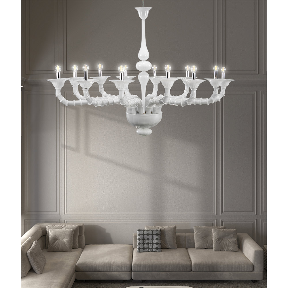Ein Kunstwerk, das sich durch einen Triumph kostbarer Details aus mundgeblasenem weißem Rezzonico-Glas auszeichnet, das große Bereiche des Hauses wie Esszimmer oder Wohnzimmer vervollständigt und eine hochwertige Beleuchtung mit einer faszinierenden Persönlichkeit zum Leben erweckt. Die Länge der Arme wird durch die spezielle Technik, die als "Bossole" bezeichnet wird, ermöglicht, die darin besteht, mehrere Glasteile zusammenzusetzen, die ein Zeugnis von großer Handwerkskunst sind .