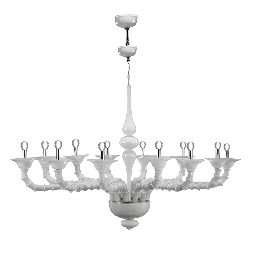 Mundgeblasener Kronleuchter aus weißem venezianischen Glas mit 12 Lichtern, klassischer Stil.