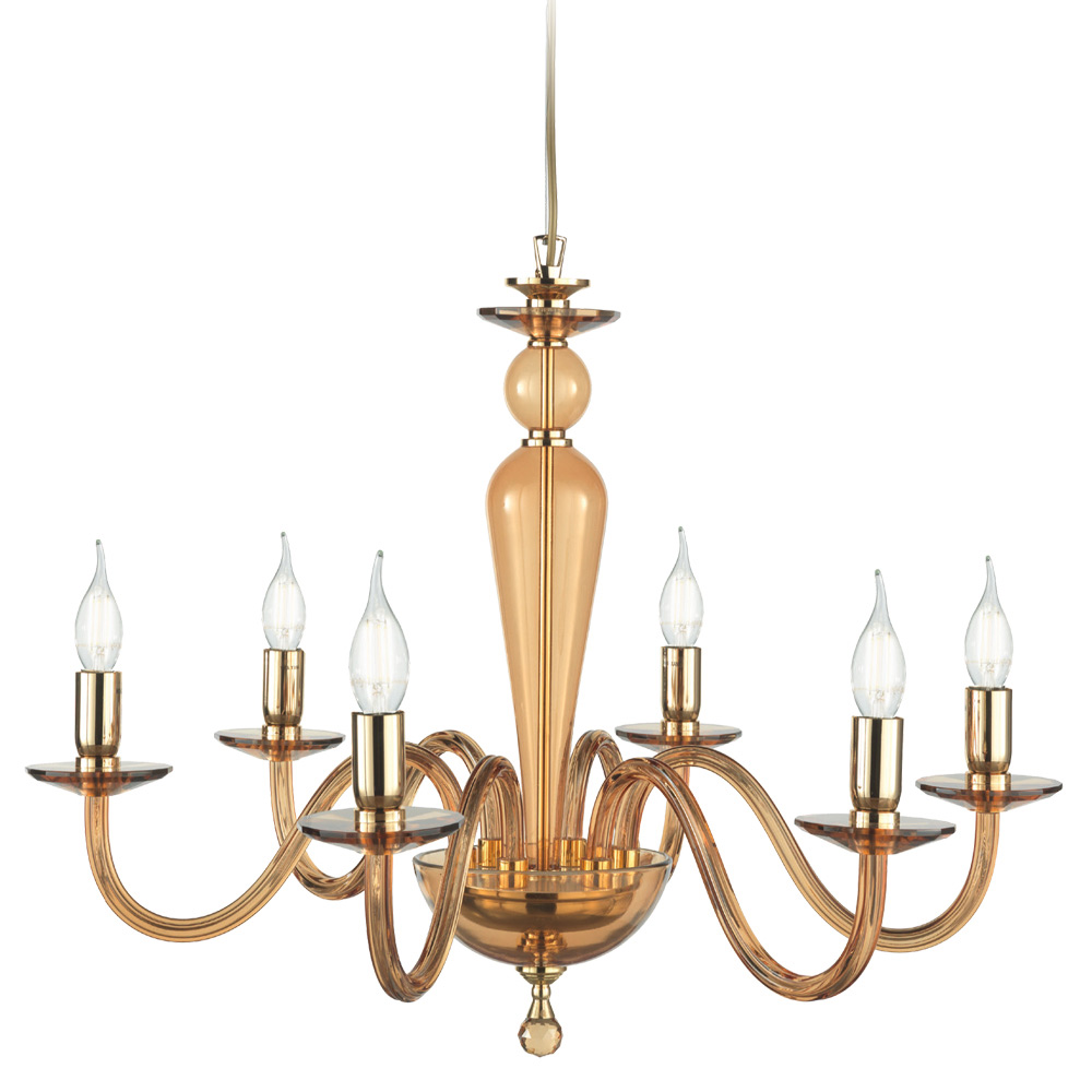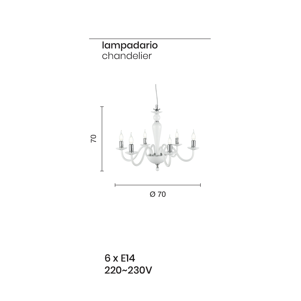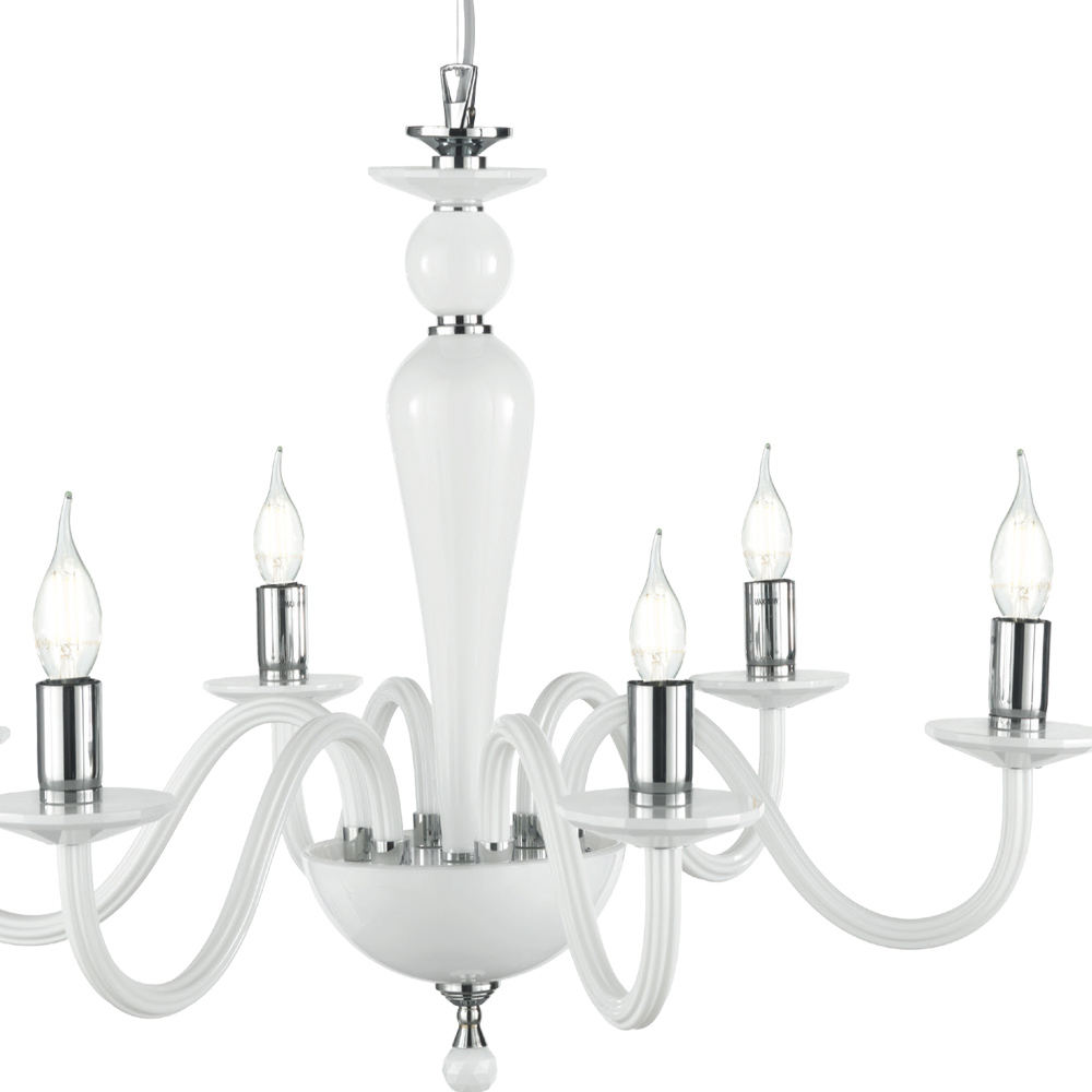 Dieser Hängeleuchter im klassischen Stil besteht aus 6 in Italien handgefertigten Bogenarmen aus Glas, die die Untertassen mit den Lichtquellen tragen.