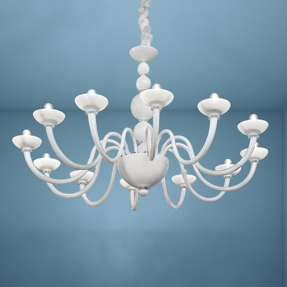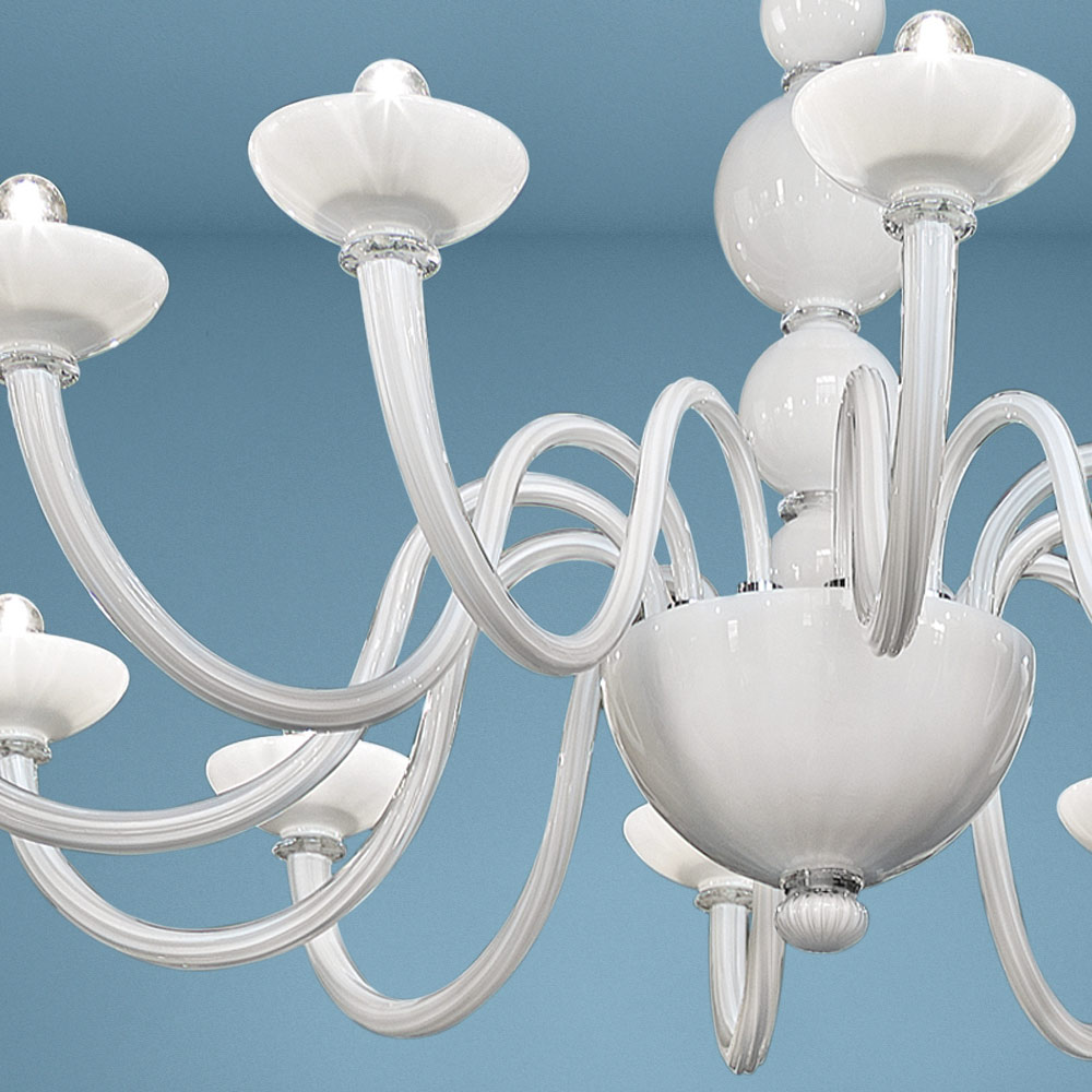 Handgefertigter Kronleuchter aus venezianischem Glas in milchweißem Kristall-Finish mit Details aus poliertem, verchromtem Metall . Ein Möbelstück mit einer erstaunlichen und ikonischen Präsenz, das sich durch eine weiche und zarte Linie und raffinierte Rundungen auszeichnet, die sich perfekt an klassische Umgebungen, aber gleichzeitig auch an Räume mit zeitgenössischem Stil anpassen. Das Element der Tradition wird durch seine wunderbaren Komponenten aus vollständig von Hand gefertigtem mundgeblasenem Glas unterstrichen, das sich dank trendiger Farben verwandelt, um sich selbst zu aktualisieren. Seine umhüllenden Formen machen es zu einem idealen Element, um jede Wohn- und Objektumgebung mit Klasse und Dynamik zu besetzen.