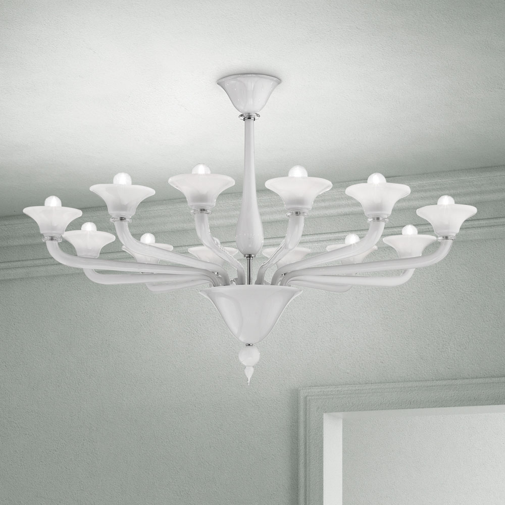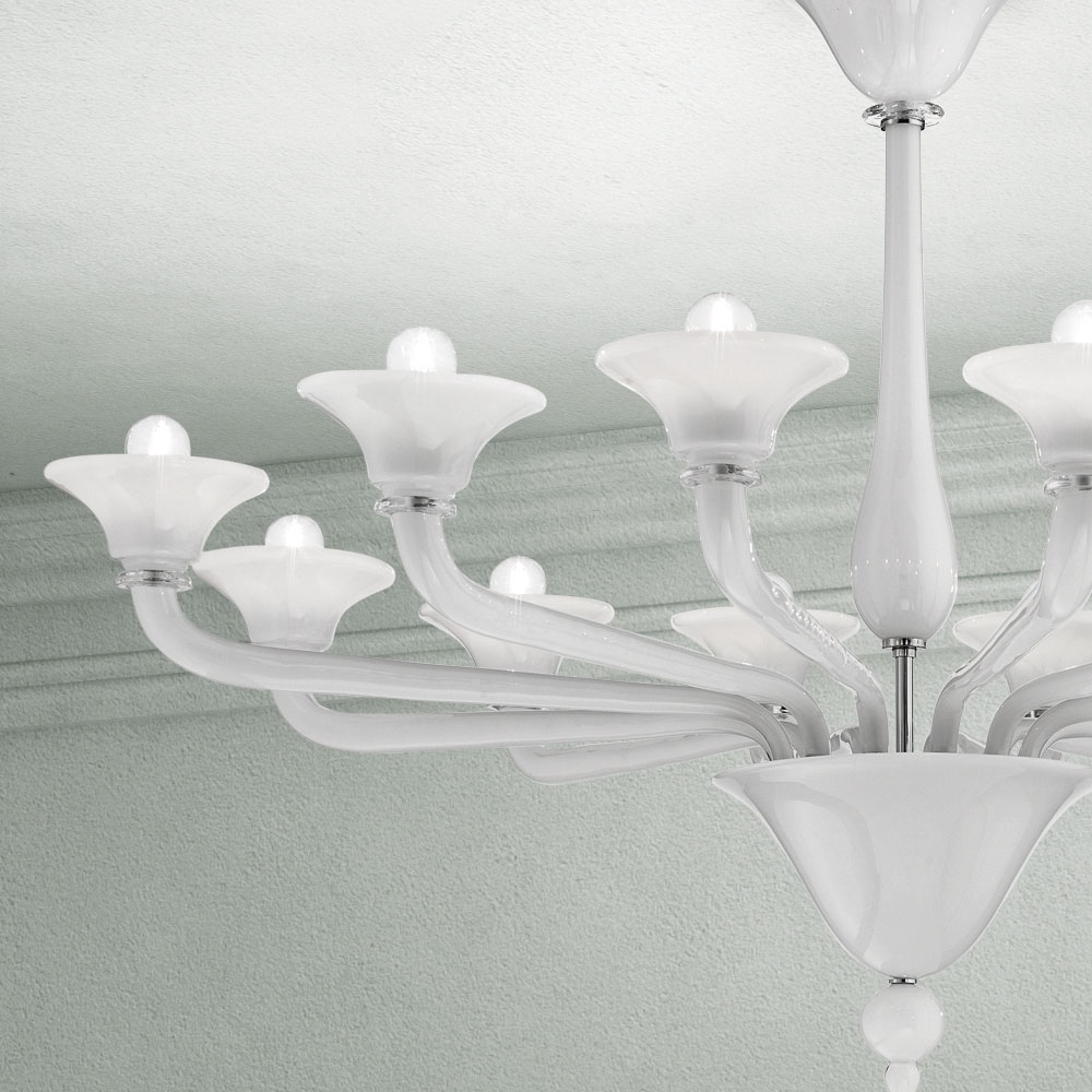 12-flammiger Kronleuchter aus Venedig-Glas mit milchweißem Kristall-Finish mit Metalldetails in glänzendem Chrom-Finish . Eine beispiellose Begegnung zwischen historischen Linien und zeitgenössischem Design , um einem Möbelstück mit zeitlosem Charme und Eleganz Leben einzuhauchen. Ihre Ästhetik zeichnet sich durch ein gegliedertes Volumen aus, das durch die leuchtende Vibration der wunderbaren mundgeblasenen Glasflächen dynamisch und leicht wird, die die eleganten transparenten Arme mit den Schalen abwechseln, die durch die Verwendung der Gehäusetechnik hergestellt werden . Seine Wertigkeit wird durch die Liebe zum Detail unterstrichen, die von den verchromten Metallkomponenten ausgeht, die es dem Produkt ermöglichen, sich an unterschiedliche Geschmäcker und Anwendungssituationen anzupassen.