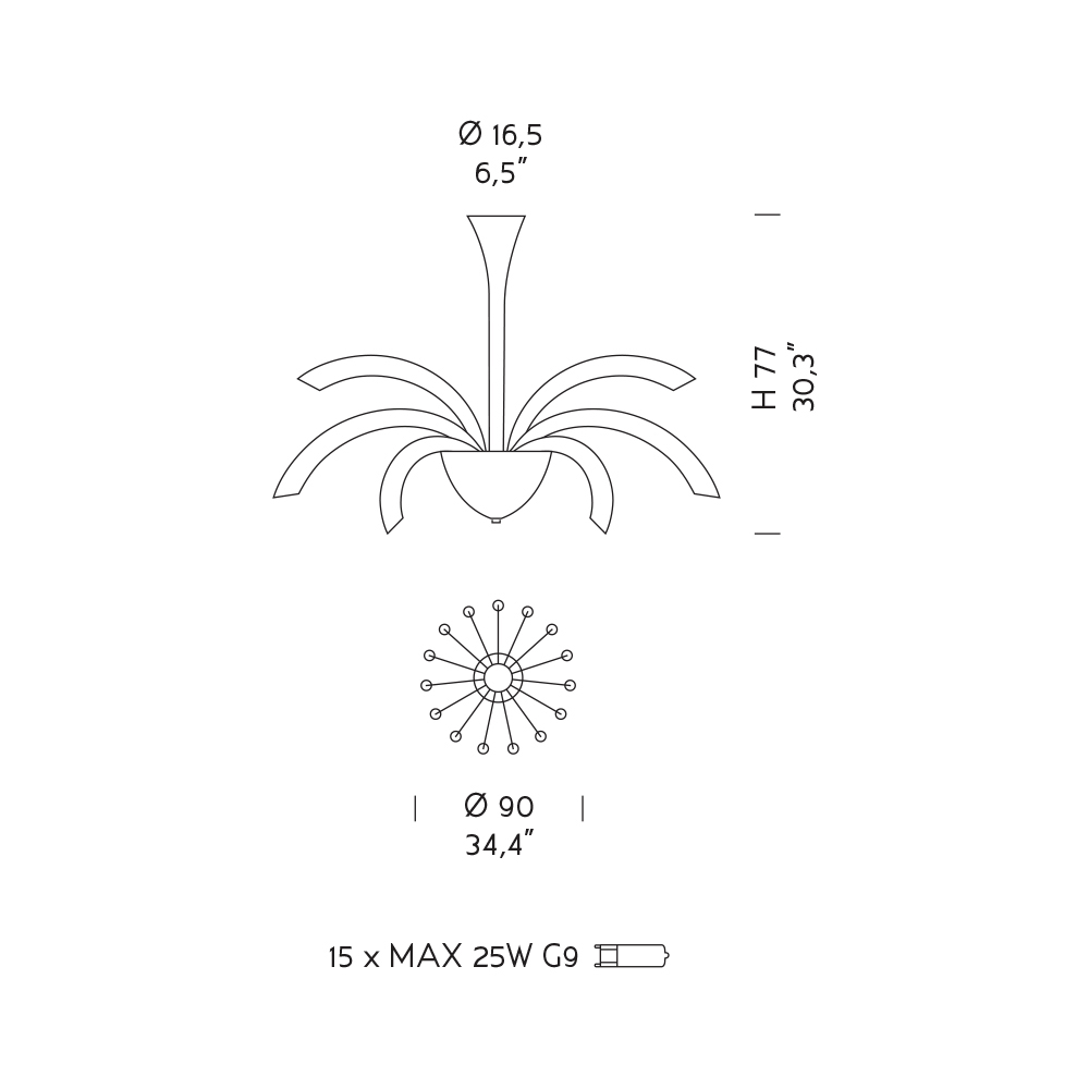 Kronleuchter mit 15 Lichtern aus venezianischem Glas, handgefertigt von erfahrenen italienischen Handwerkern, angereichert mit verchromten Metalldetails . Eine faszinierende Ästhetik, die sich dank ihrer Formen und der Funktionalität ihres Designs an jede Art von Umgebung anpasst, in die sie sich mit Überschwänglichkeit einfügt. Die wunderschönen und elegant geschwungenen Arme erweitern sich nach außen, um Licht in verschiedene Richtungen zu bringen und den Raum durch einen originellen szenografischen Effekt zu beleuchten, der an die Explosion eines Feuerwerks erinnert, um ein kreatives , raffiniertes und starkes visuelles Ergebnis zu erzielen.