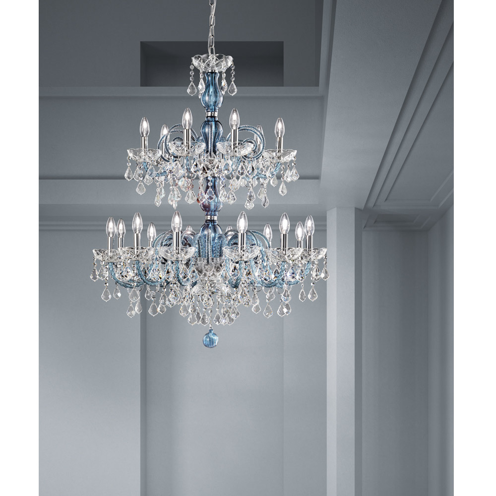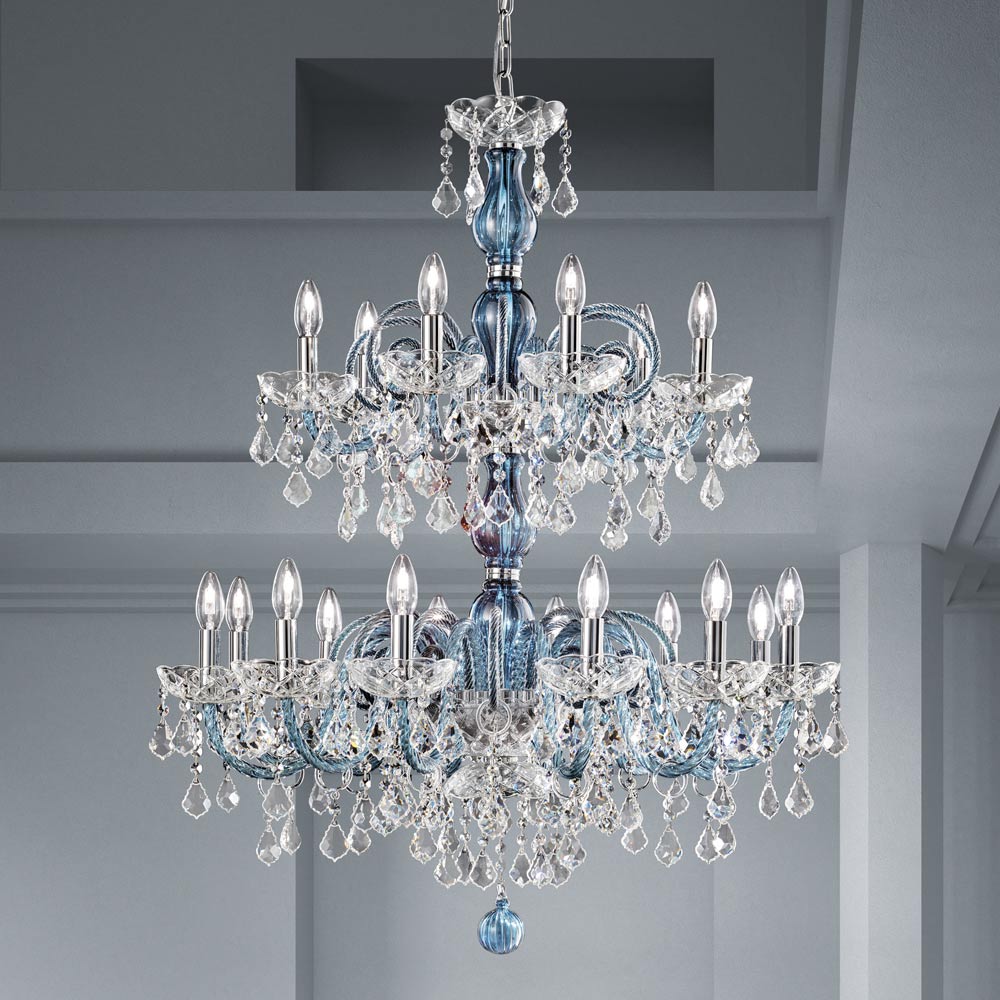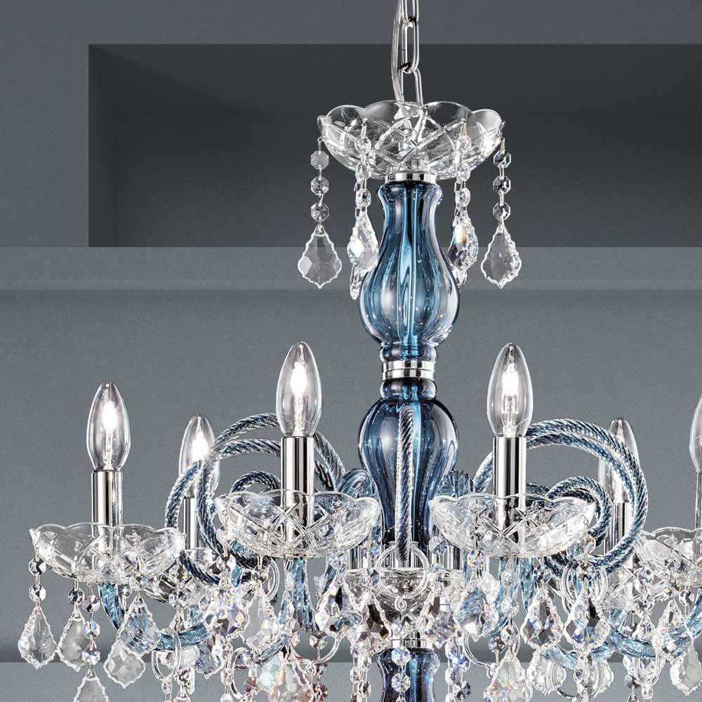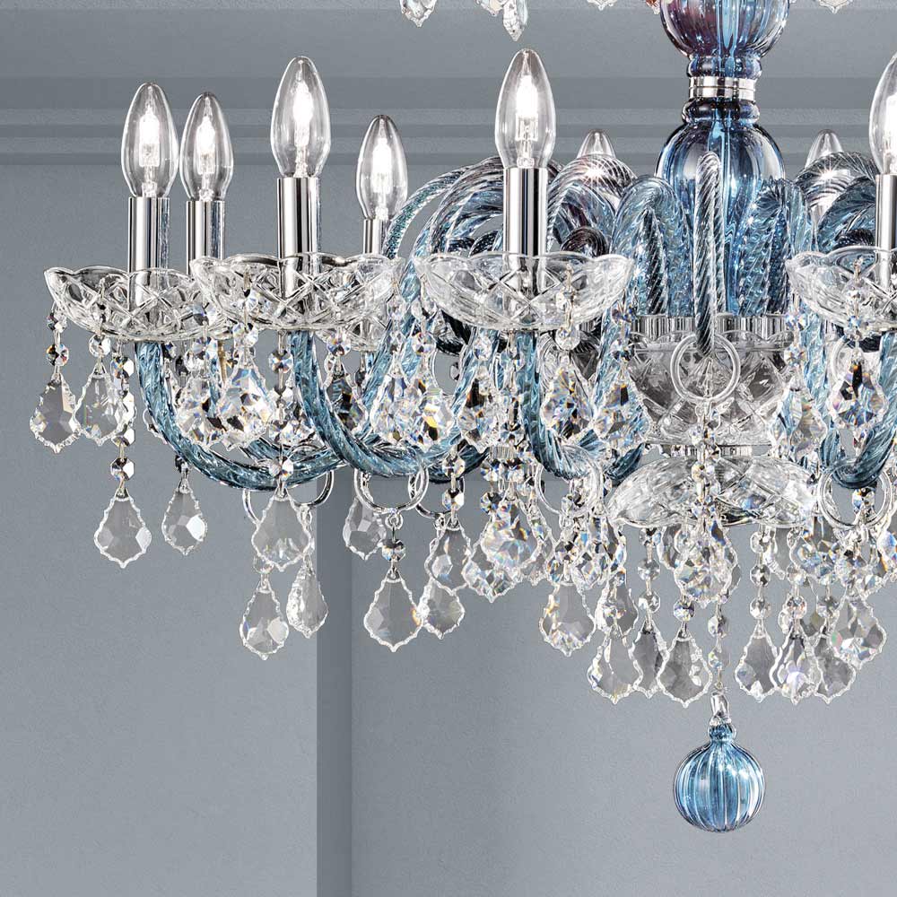 18-flammiger Kronleuchter aus venezianischem Glas in Denim-Optik mit Bleianhängern und poliertem verchromtem Metall . Diese handwerklich hergestellte Ergänzung zeichnet sich durch die wunderbaren Arme aus, die von Hand durch die Verdrehungstechnik bearbeitet wurden, wodurch ein exklusives Ergebnis entsteht, das ästhetisch an die Verflechtung eines Seils erinnert und dem Kronleuchter Persönlichkeit verleiht. Ein echter Lichtregen dringt in die Struktur des Kronleuchters ein und breitet sich dann durch Brechung durch die Magie von Pailletten und Kristallanhängern mit feinen Oberflächen in der Umgebung aus und erzeugt so einen eindrucksvollen und traumhaften szenografischen Effekt , der verzaubern und überraschen kann. für seine Eleganz und Majestät .