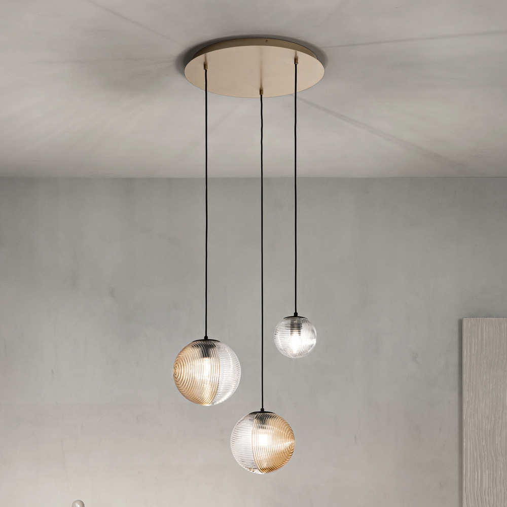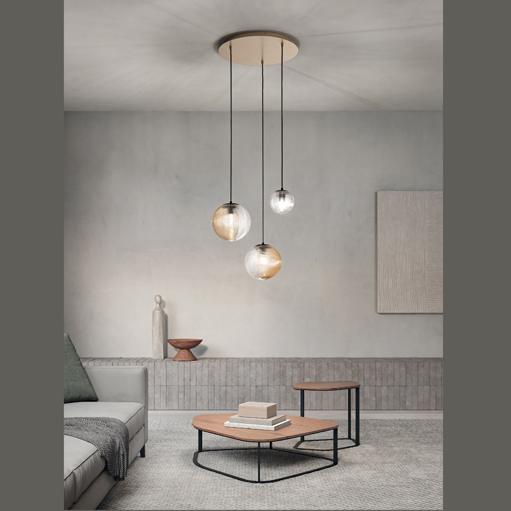 Tauchen Sie mit diesem Hängeleuchter in eine Atmosphäre moderner Eleganz ein, die jedem Raum einen Hauch von dezentem Luxus verleiht. Die leuchtenden Kugeln hängen in einem harmonischen Tanz aus Licht und Reflexionen , jede in mundgeblasenem Glas mit unterschiedlichen Oberflächen eingeschlossen, und reflektieren ein warmes und einladendes Licht .