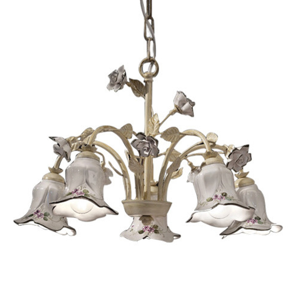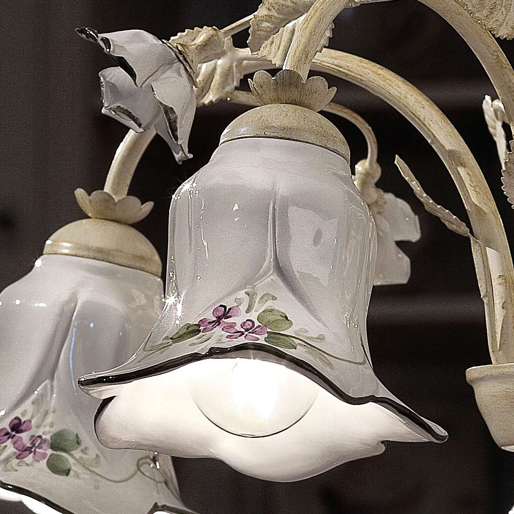 Kronleuchter mit 5 Lichtern aus Metall und handverzierter Keramik und Rosen - Pisa