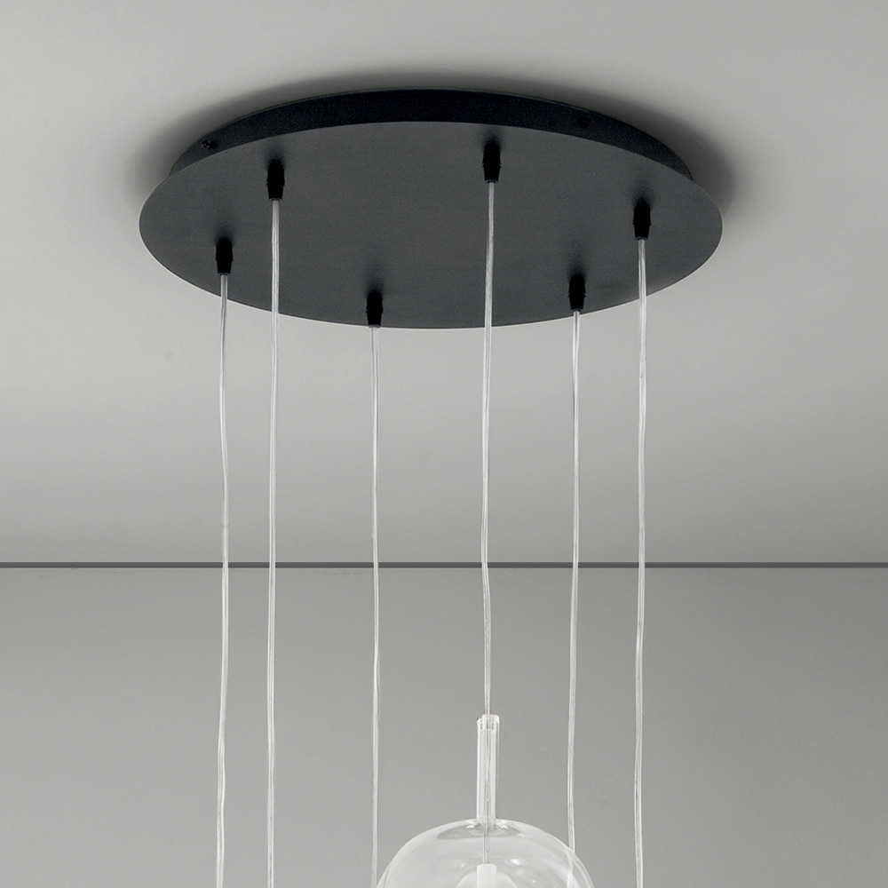 Kronleuchter mit Deckensockel aus schwarzem Metall und Diffusoren aus geblasenem Glas , gekennzeichnet durch eine Doppelschicht: innen aus satiniertem Glas und außen aus farbigem Glas . Kappe aus Polymermaterial zur Stabilisierung des Kabels in einer zentralen Position. Verstellbare Kabel mit einer maximalen Länge von 250 cm.