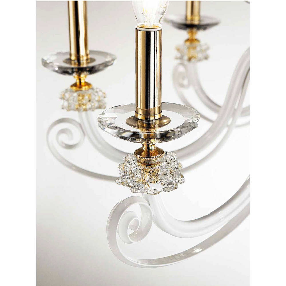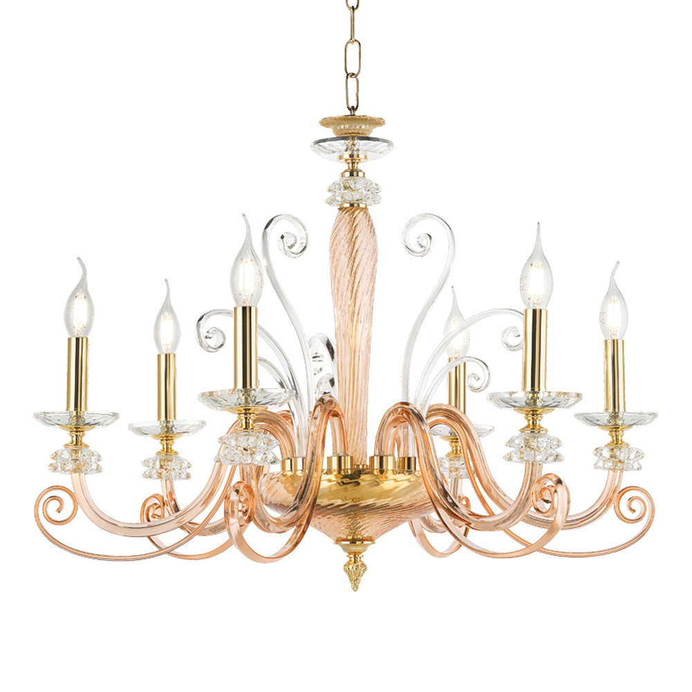Handgefertigter Kronleuchter mit 6 Lichtern aus mundgeblasenem Glas und optischem Kristall, Luxus made in Italy.