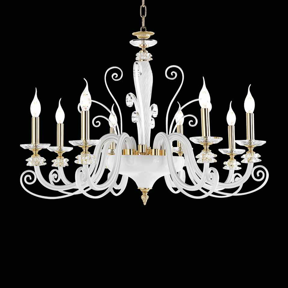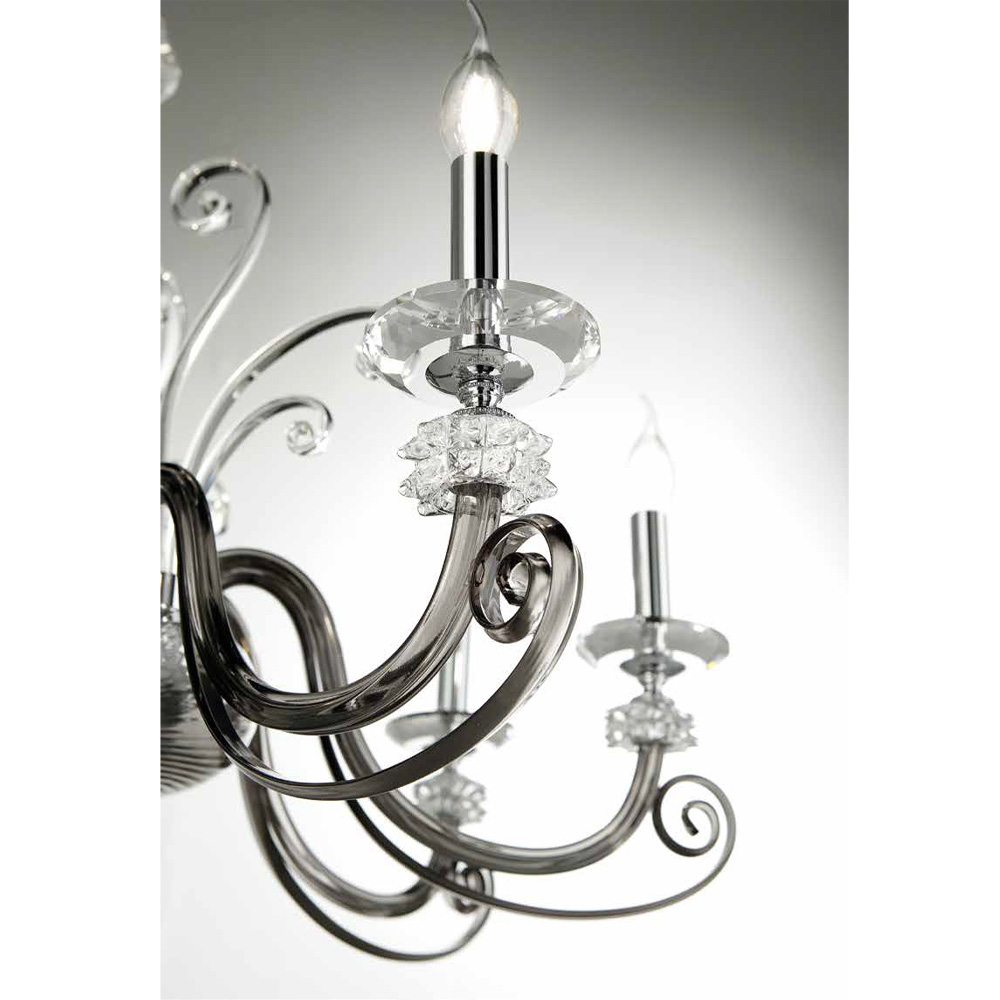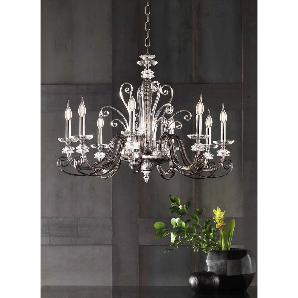 Handgefertigter Kronleuchter mit 8 Lichtern aus mundgeblasenem Glas und optischem Kristall, Luxus made in Italy.