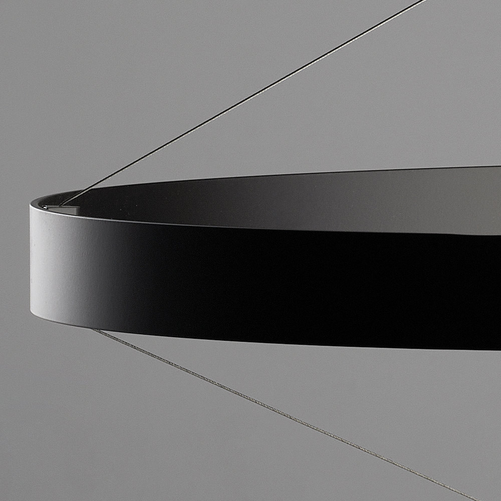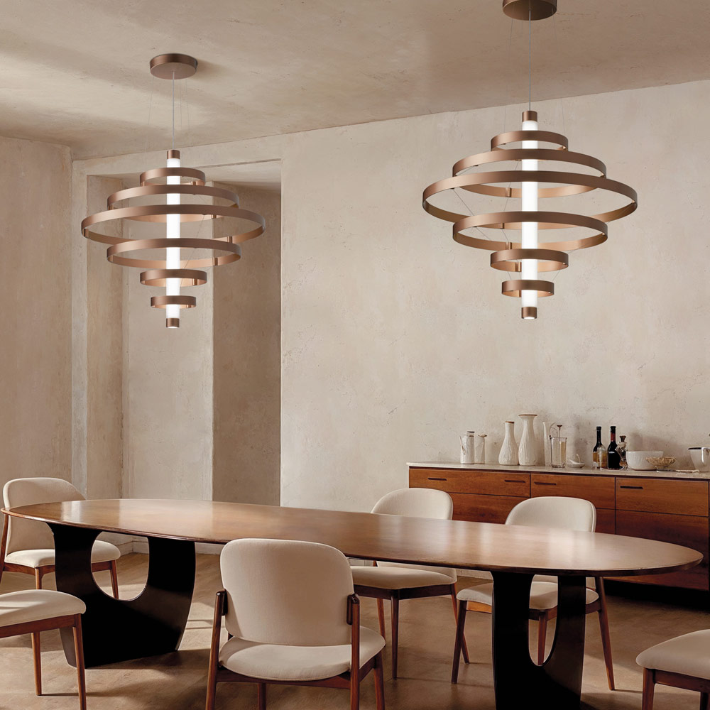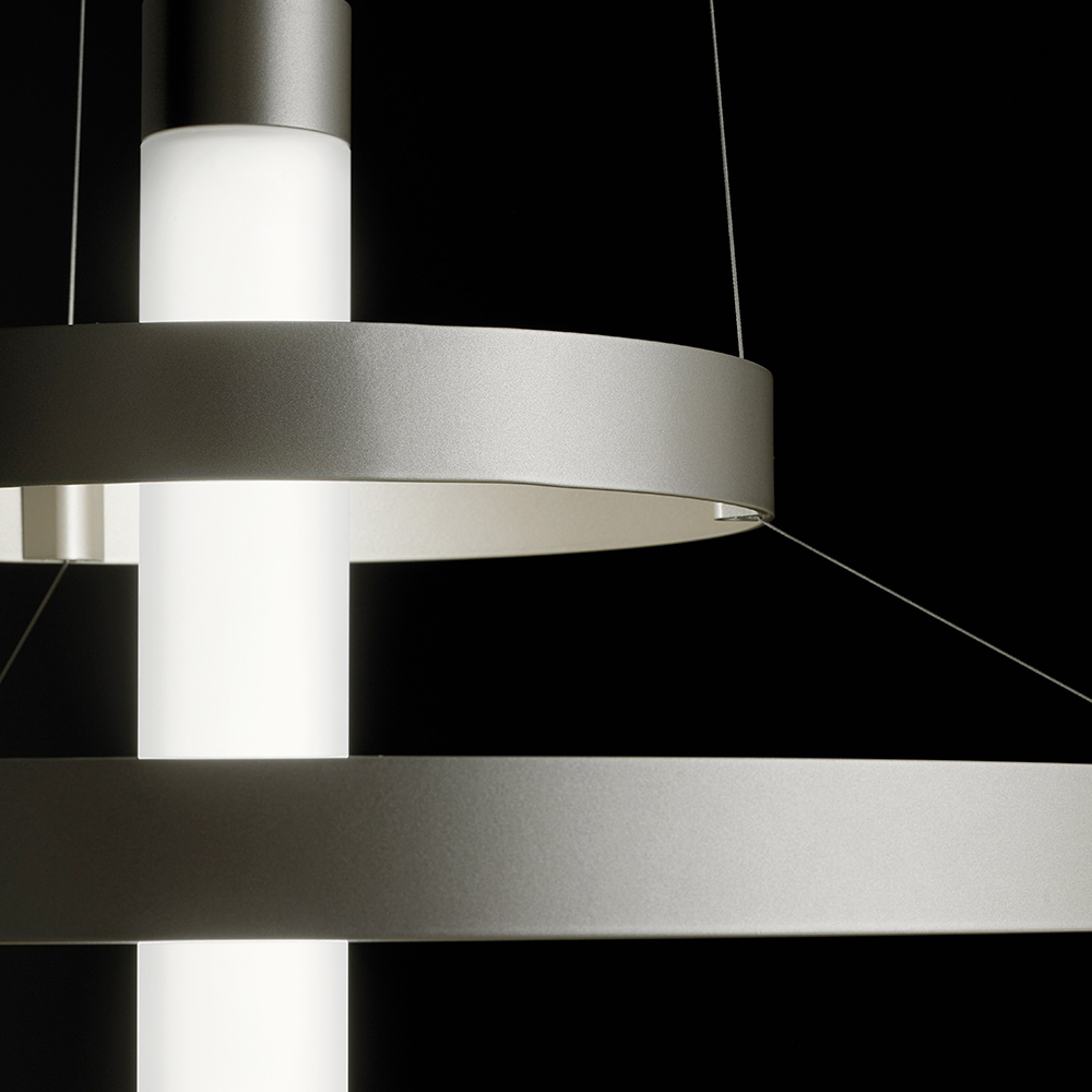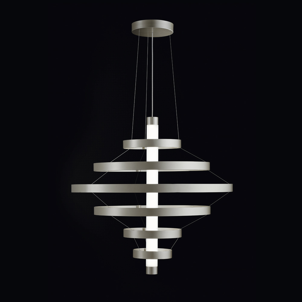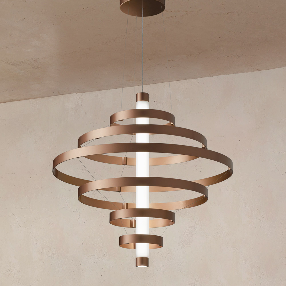 Diese Pendelleuchte ist ein echter Protagonist in jedem Raum: eine leuchtende Skulptur, die den Blick auf sich zieht und der Umgebung Persönlichkeit und Prestige verleiht. Die Struktur besteht aus einer Reihe konzentrischer Aluminiumringe , die harmonisch um den zentralen Körper angeordnet sind und einen dynamischen, eleganten und dreidimensionalen visuellen Effekt erzeugen.