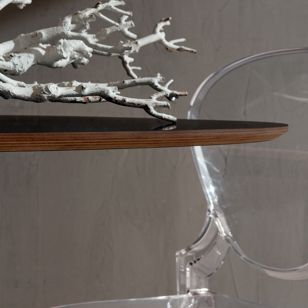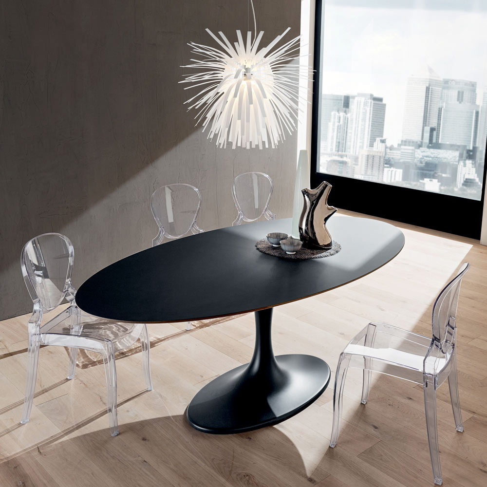 In Italien hergestellter Esstisch mit ovaler Platte aus Birkensperrholz mit Oberfläche in schwarzem Fenix- Finish und Sockel aus Mineralmarmor (synthetischer Marmor). Ein äußerst origineller und kreativer Stil zeichnet dieses Möbelstück mit einer eleganten Seele und einer fast futuristischen Ästhetik aus, das dank seiner besonders innovativen Persönlichkeit jede Umgebung einzigartig machen kann. Die ungewöhnlichen Linien, die entlang der gesamten Basis verlaufen, fügen sich perfekt in die ovale Form der Platte ein und erzeugen so ein Gefühl von Bewegung und eine herrliche Harmonie der Formen . Der besondere Kontrast zwischen der Sperrholzplatte und der Fenix-Beschichtung bereichert das endgültige Design des Tisches noch mehr und macht ihn besonders geeignet für diejenigen, die es lieben, ihre Räume auf raffinierte und völlig revolutionäre Weise einzurichten. Die verwendeten hochwertigen Materialien und die 100 % Made in Italy-Verarbeitung erhöhen die Qualität und den Wert und ermöglichen es uns, eine ebenso schöne und elegante wie solide, widerstandsfähige und funktionale Einrichtungslösung anzubieten.