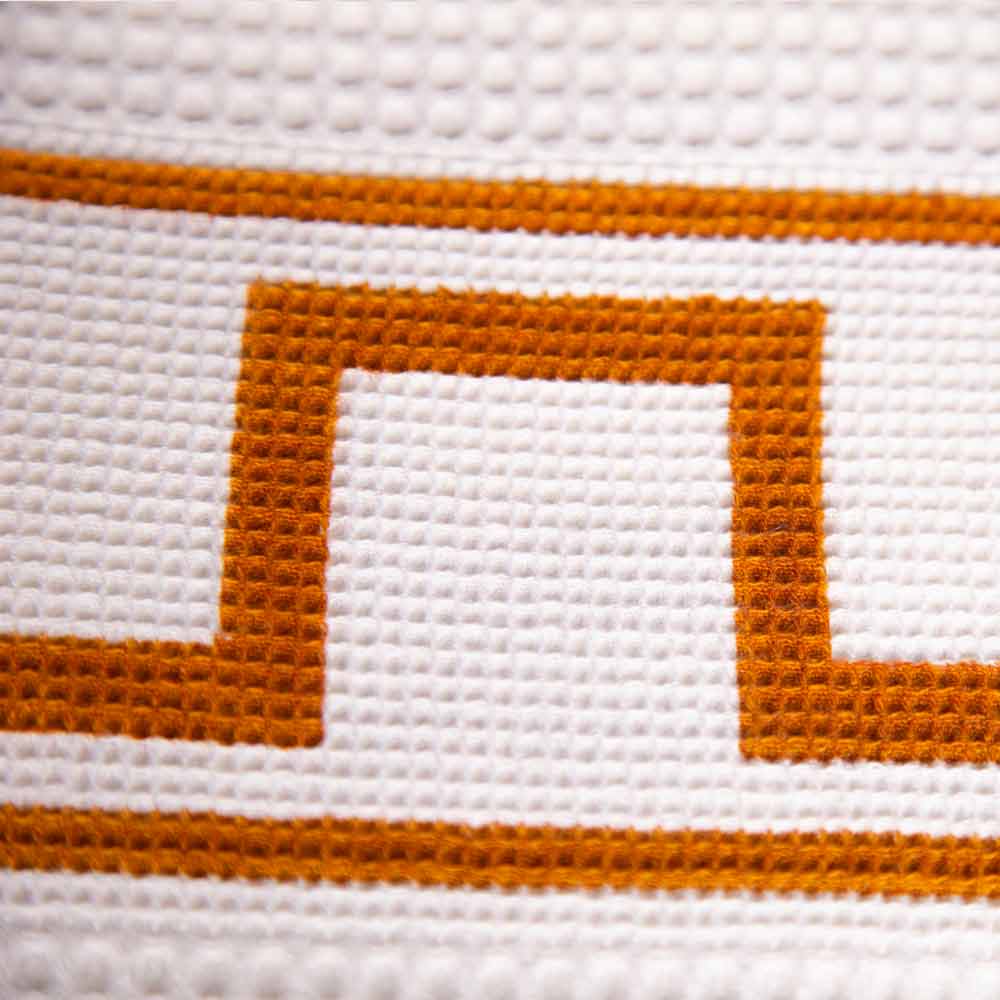Badetuch aus reinweißer Wabenbaumwolle mit rostfarbenem pompejischem griechischen Druck, handgefertigt, handgefertigte Kreation made in Italy Unikat.