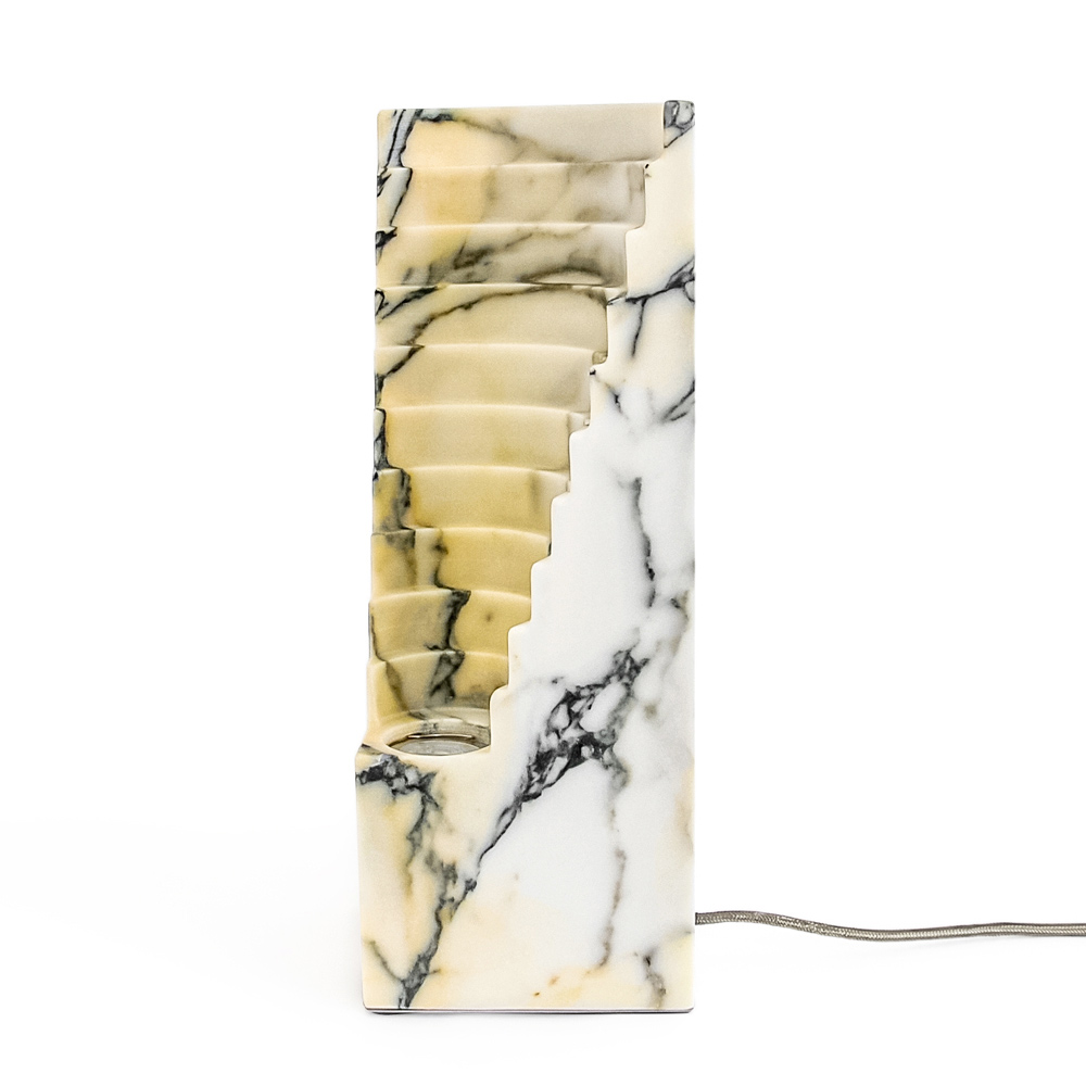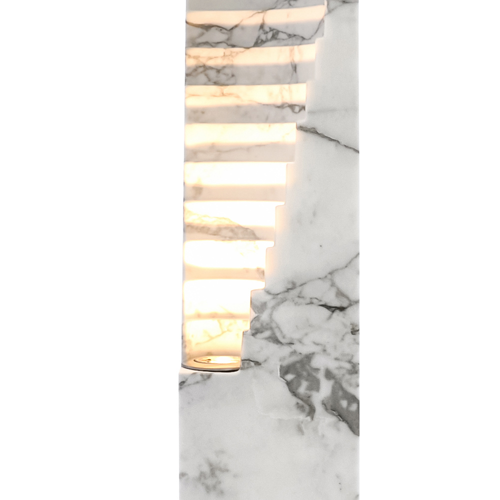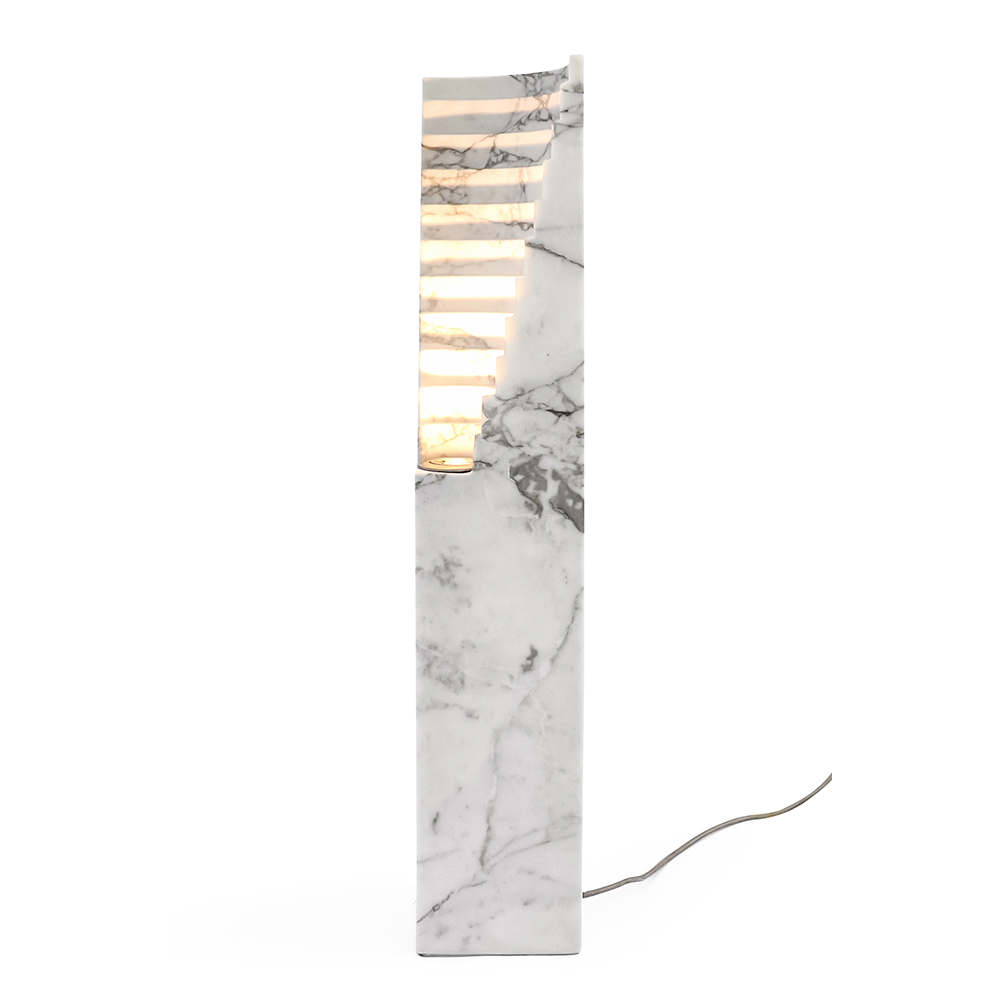 Lassen Sie sich von dieser Marmorlampe verzaubern, einem wahren Juwel zeitgenössischen Designs . Die vertikale Struktur, majestätisch und schlank, ist fachmännisch geschnitzt, damit das Licht durch ihre geometrischen Linien fällt. Jedes Marmorsegment mit seiner einzigartigen Maserung wird zu einer lebendigen Leinwand, die Licht in einem Spiel aus Hell-Dunkel einfängt und streut, das jede Umgebung bereichert.