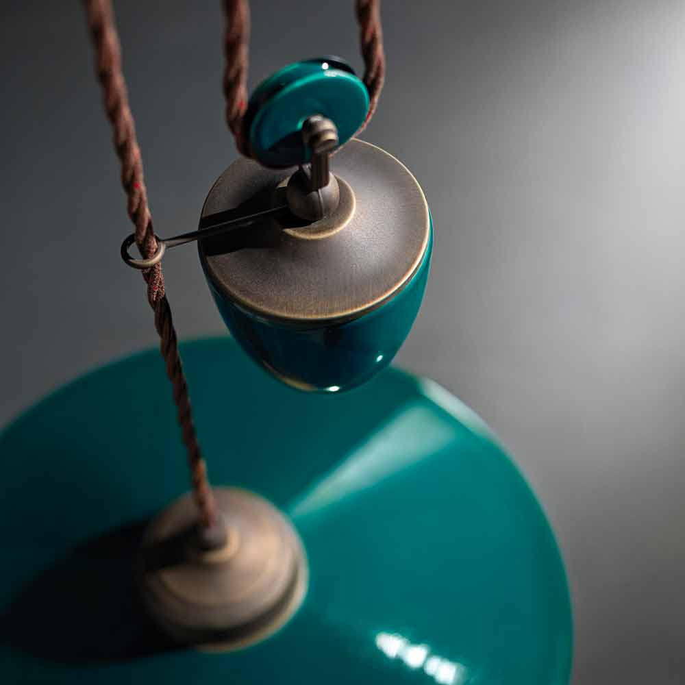 Farbige Keramik passt gut zu antikem Messing und diese Verbindung ist die Stärke dieser Lampe.