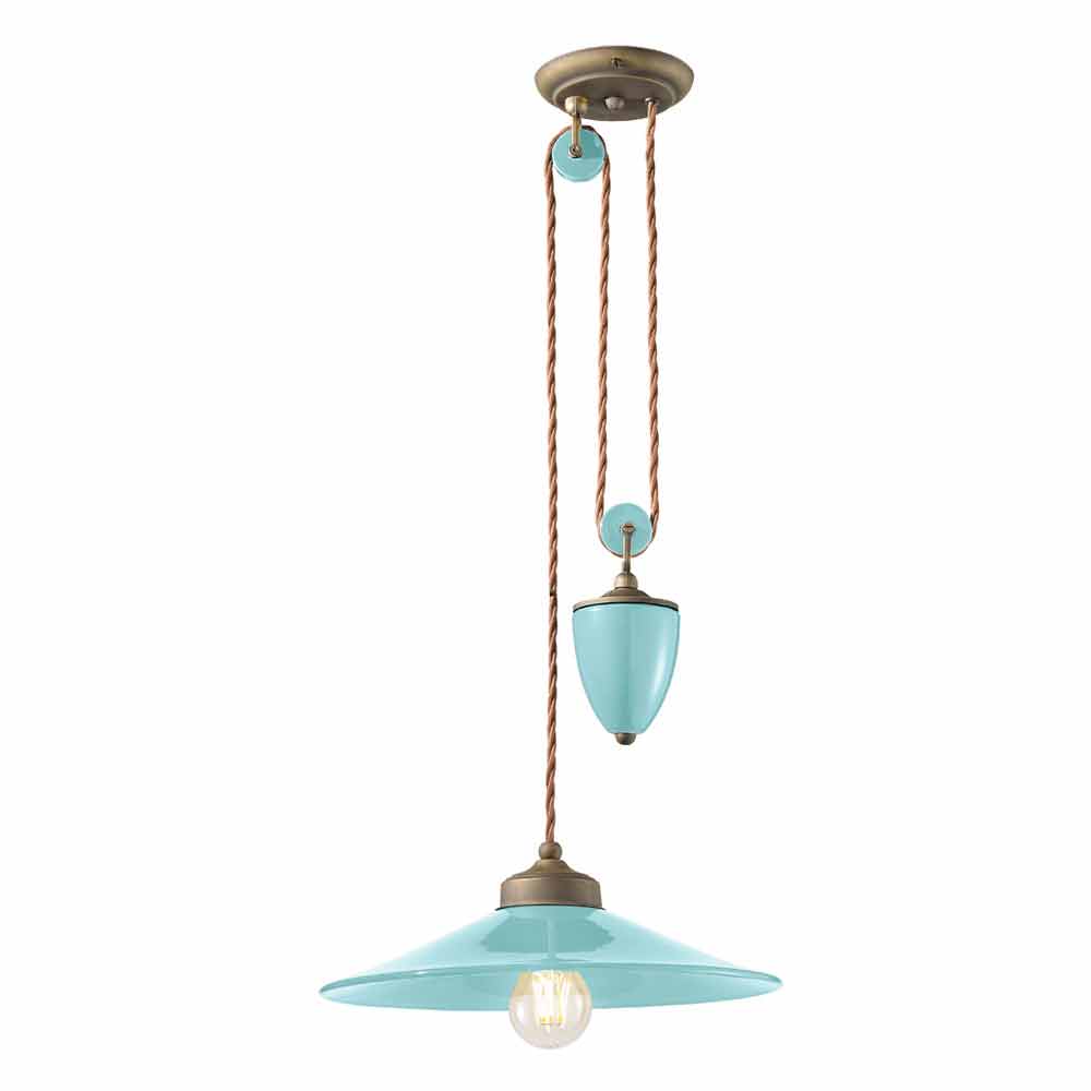 Diese wunderschöne Pendelleuchte besteht aus einer antiken Messingstruktur mit einem Diffusor aus glänzend farbiger Keramik, erhältlich in verschiedenen Farben.