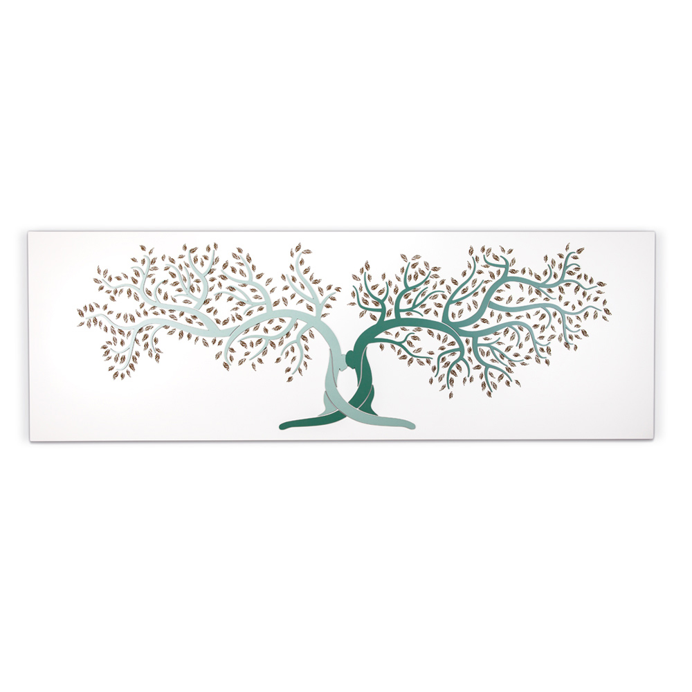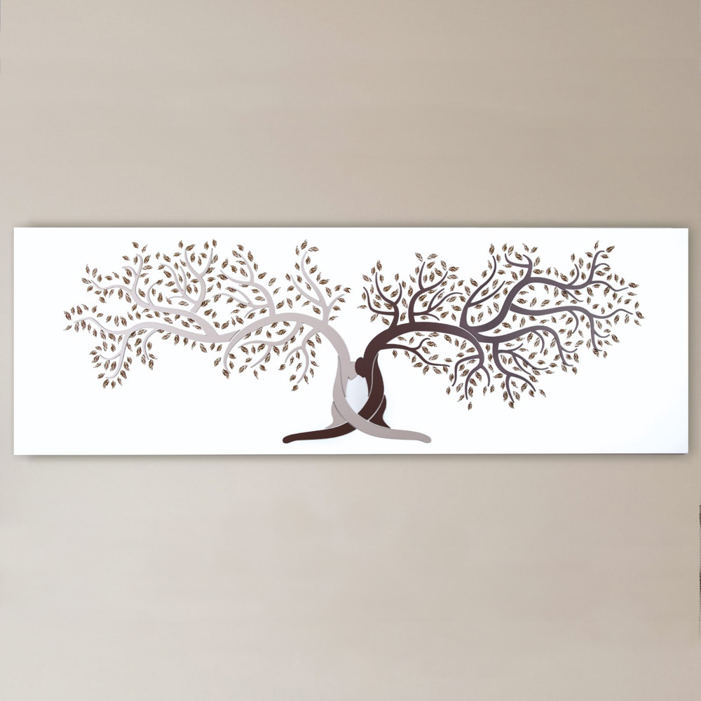 Dekorative Tafel , die die Vereinigung zweier Stämme mit einer Umarmung darstellt, Symbol des Lebens. Vom Stamm zweigen mit Lasermarkierung versehene Zweige und Blätter ab. Mattweiß lackierte Holzplatte mit Applikationen aus lackiertem Holz in zwei Kies- und Kakaotönen oder in der grünen Variante und Lasermarkierung.