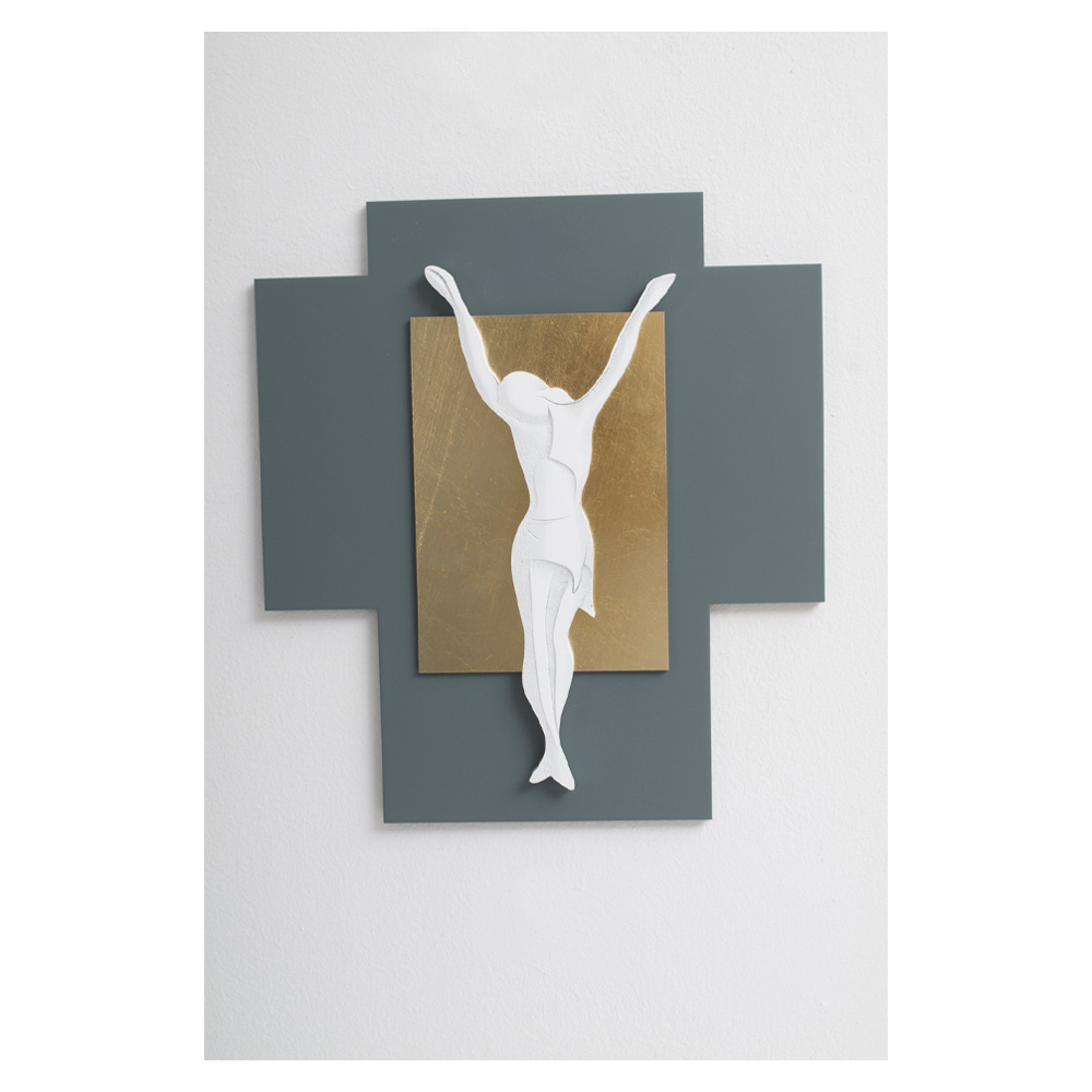 Kruzifix aus blau lackiertem Holz mit Applikation eines Quadrats aus edlem Blattgold und Jesus aus weiß lackiertem Holz mit leichten Lasergravuren.