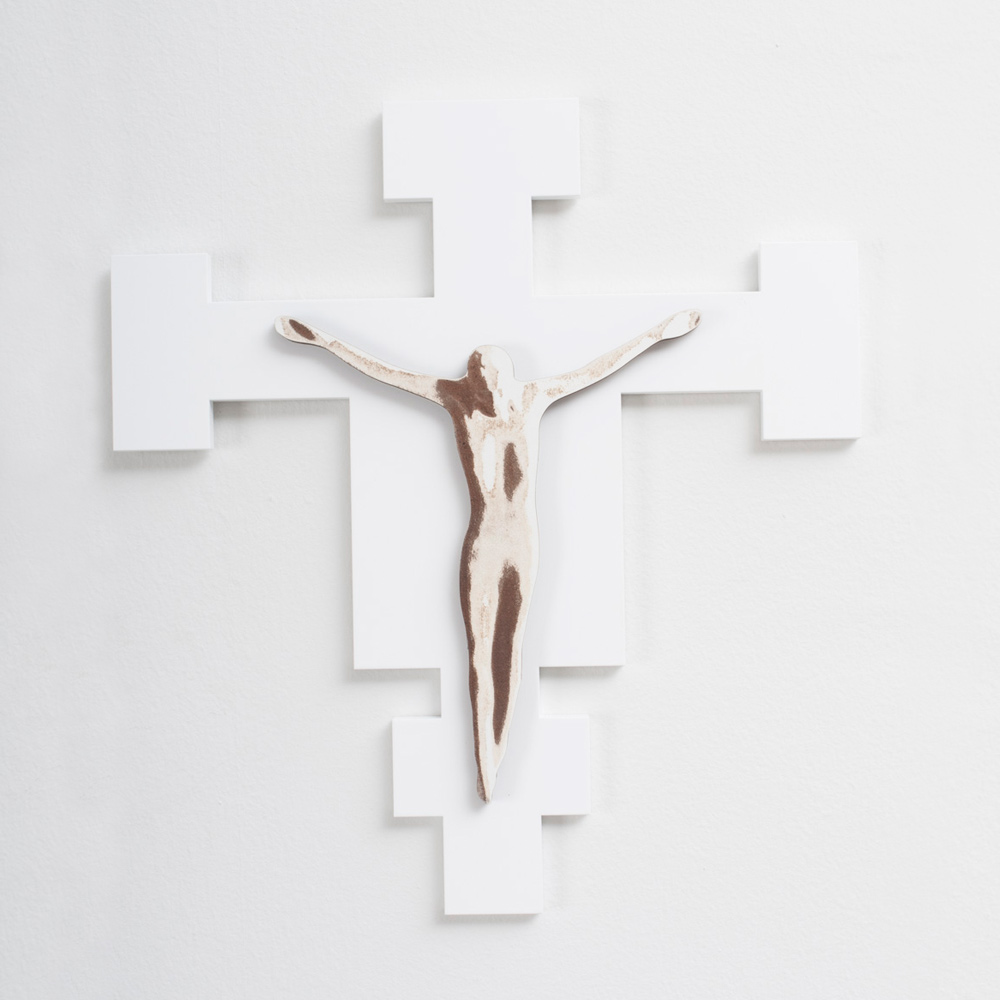 Weißes Kruzifix mit lasergravierter Christus-Applikation, hergestellt in Italien