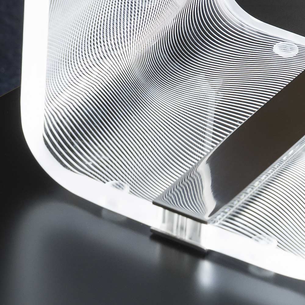 Dies führte Tischlampe ist viel mehr als eine einfache Leuchte: vollständig aus gefalteten Acrylkristall in 2 Varianten von laser- gravierten Texturen , dass die chromatischen Nuancen verbessern, leuchten die Originalstiche entlang aller Wände dank einer einzigen LED - Leiste oben platziert das Zentrum.