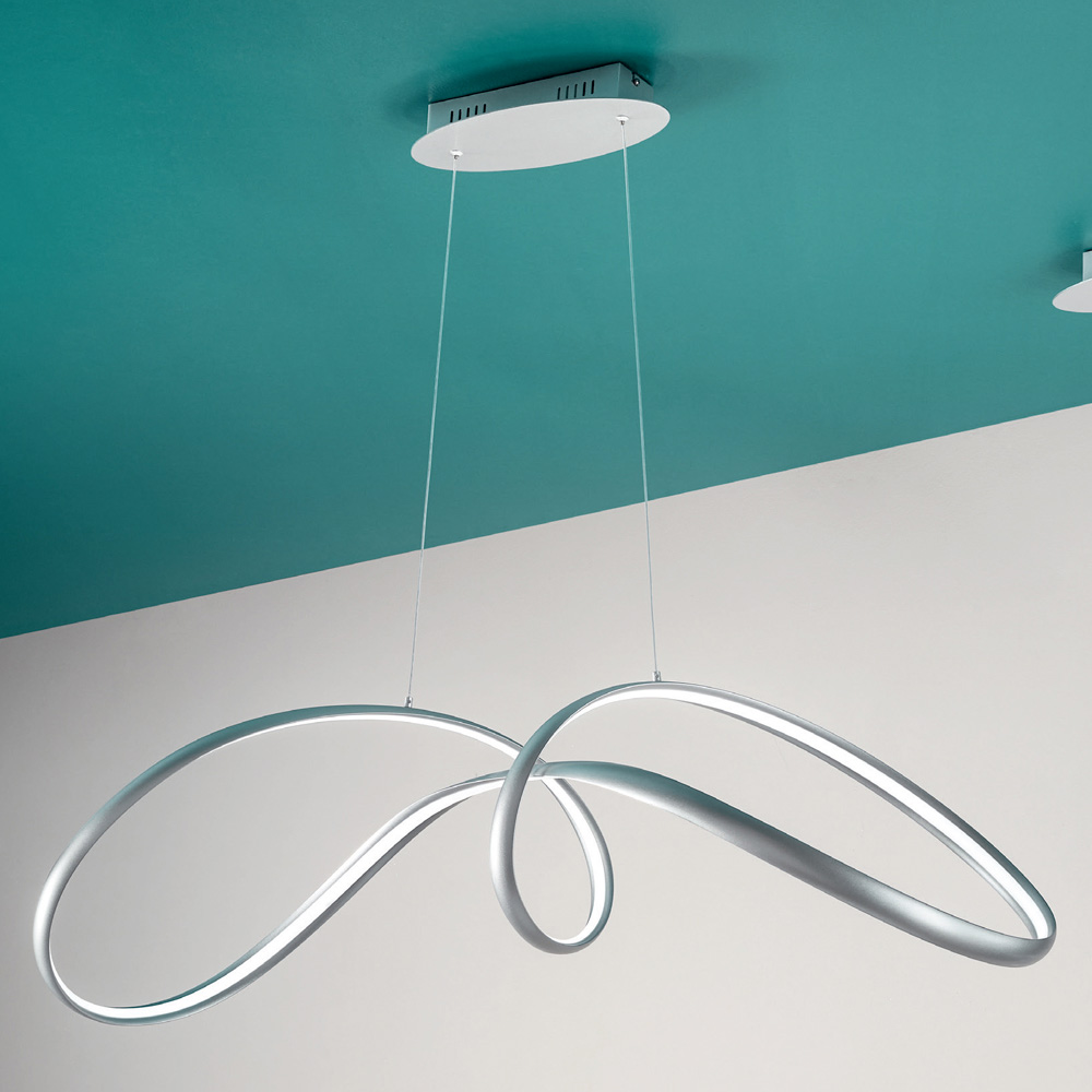 LED-Pendelleuchte aus silberfarbenem Metall und Polymer, modernes Design in zwei Dimensionen.
