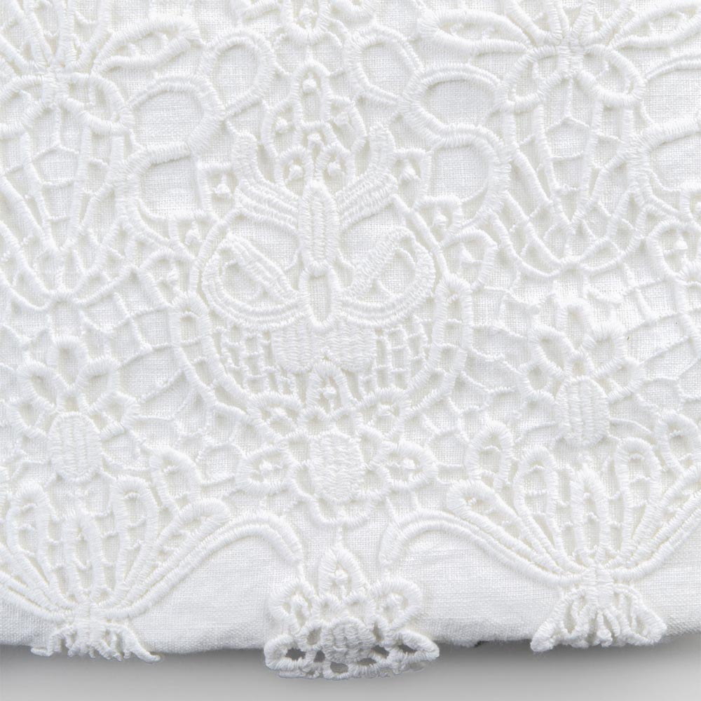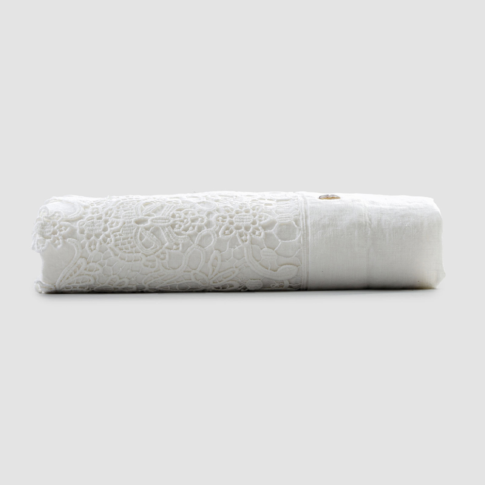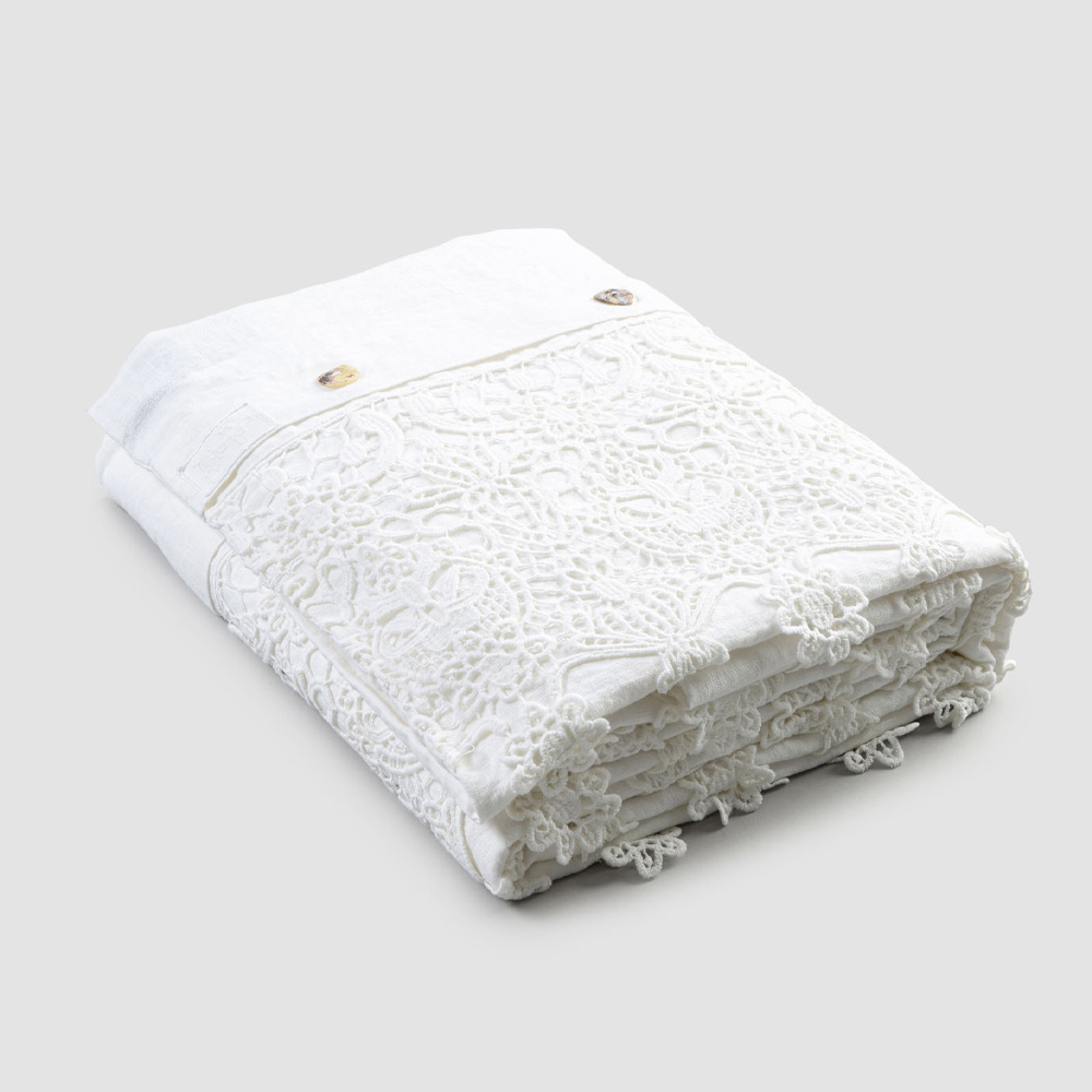 Doppelter Bettbezug aus weißem Leinen mit Spitzentropfen, handgefertigtes Luxusdesign made in Italy.