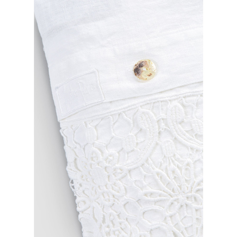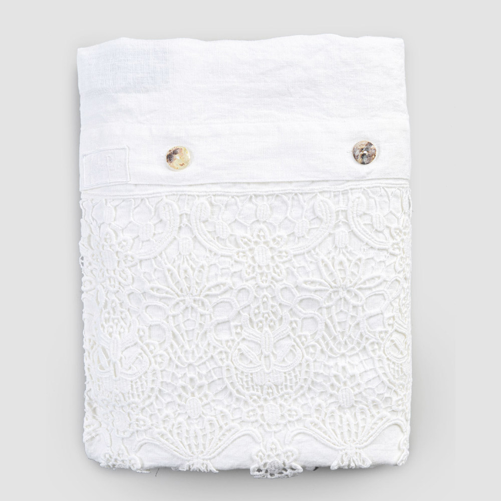 Der Wert der Tradition verbindet den modernen Lebensstil mit diesem schweren weißen Leinenbehältersack , der mit Spitze und Perlmuttknöpfen von Agoya verziert ist.