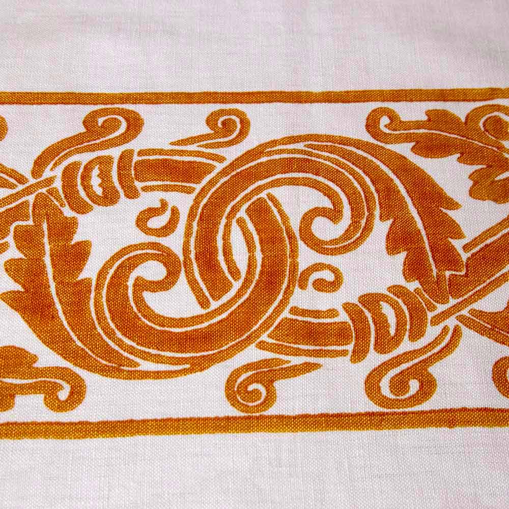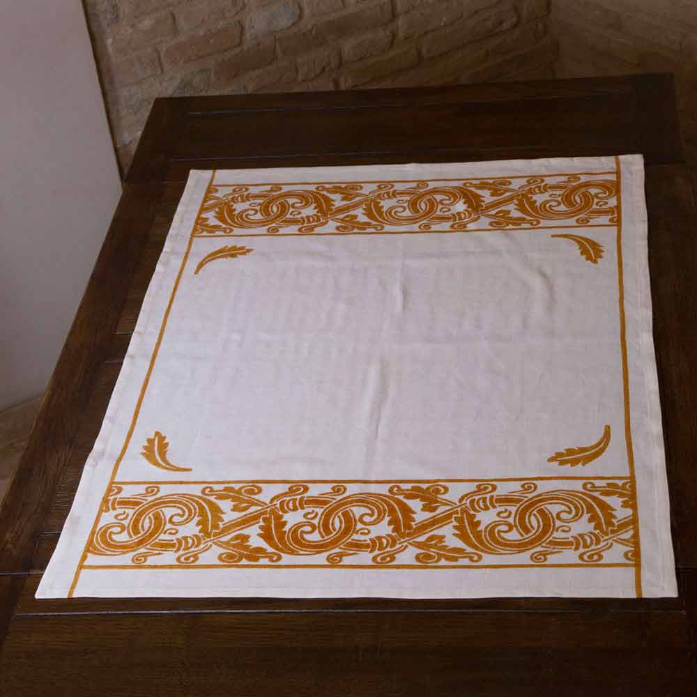 Handgemachtes Frühstücksaccessoire (Tischdecke und 2 TischServietten) aus reinem Leinen mit künstlerischem Aufdruck auf handdekorierten antiken Stoffen, erhältlich in drei Varianten, ein einzigartiges Stück Qualität, hergestellt in Italien.