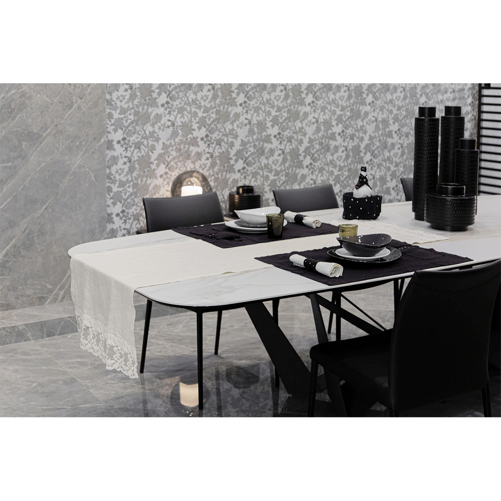 Der Wert der Tradition wird mit dem modernen Lebensstil in diesem Tischläufer aus weißem Leinen mit gefalteten Kanten und einer Spitzentextur in zwei verschiedenen Ausführungen kombiniert.