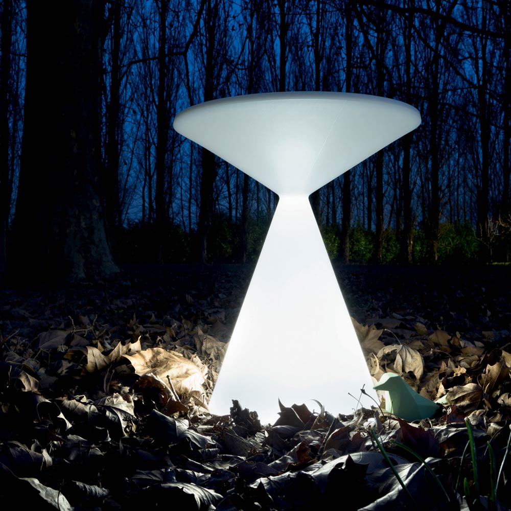 Dieser Leuchttisch für das Wohnzimmer im Freien hat ein rundes Design und ist komplett aus weißen Polyethylen, daher ist es praktisch und leicht zu reinigen.