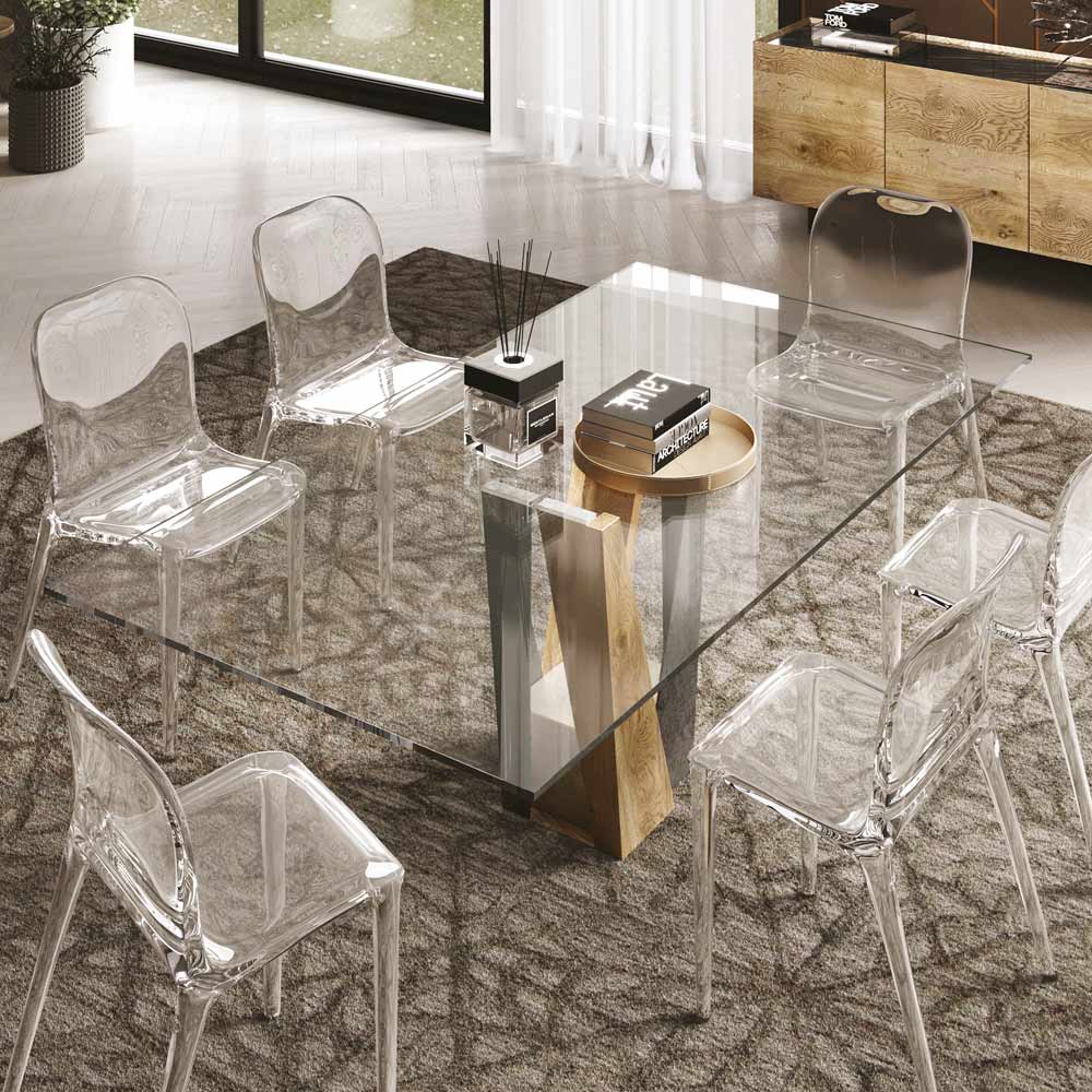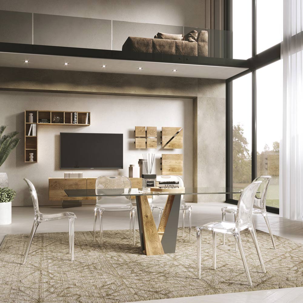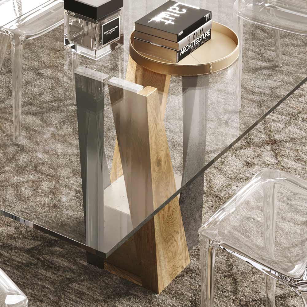 Wohnzimmertisch aus Glas mit Holzsockel und mattschwarzem Metall Made in Italy.
