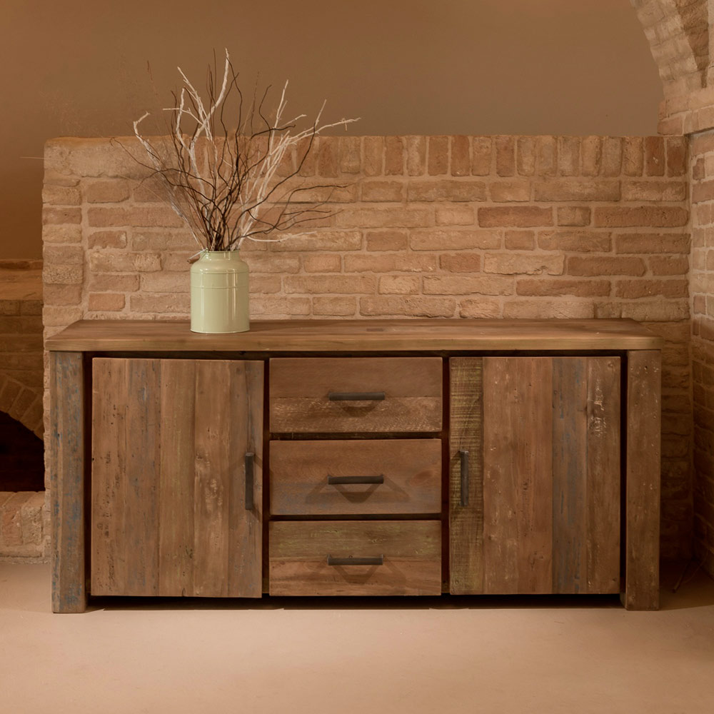 Sideboard für den Innenbereich aus Recyclingholz im Pandora-Finish mit 2 Türen und 3 zentralen Schubladen .