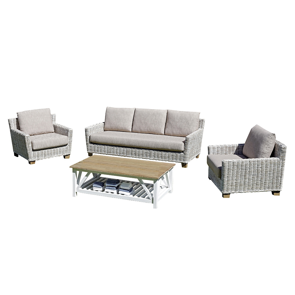 Gartenlounge mit Couchtisch aus Mangoholz inklusive Kissen.