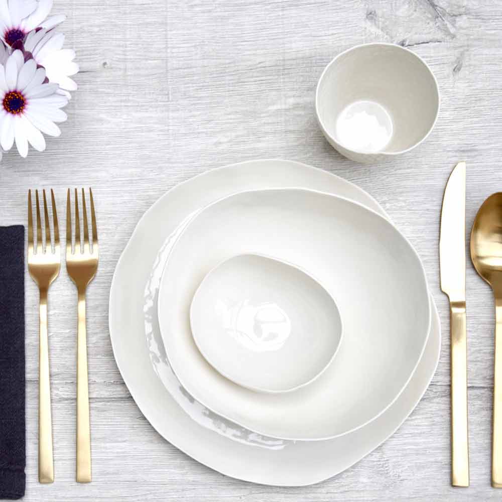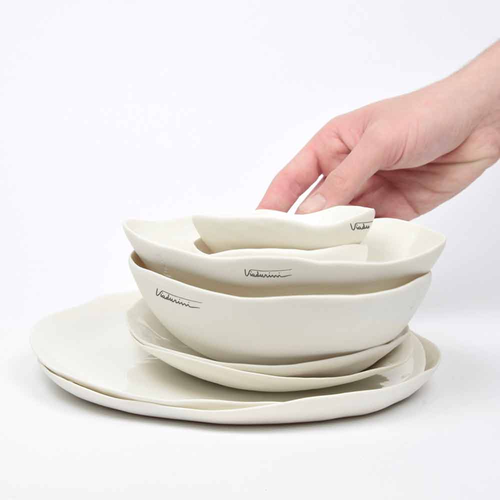 Durch die Plattentechnik erhalten , die es ermöglicht, sehr dünne Oberflächen zu erhalten, um die Eigenschaften von Porzellan und seine Transluzenz hervorzuheben, werden die Schalen dann innen mit transparentem Kristall glasiert und außen sorgfältig poliert, was Sinnlichkeit und Einfachheit der Schönheit von Porzellan ohne hervorruft seine Praktikabilität zu opfern.