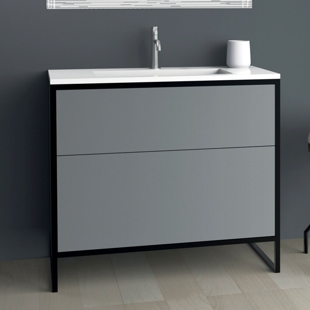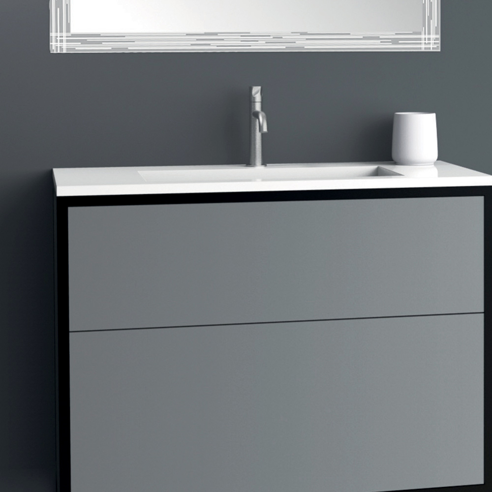Badmöbellinie zeichnet sich durch eine Struktur aus einem dünnen, mattschwarz lackierten Metallprofil, Haustüren aus matt verkehrsgrau lackiertem MDF-Holz RAL 7042 und eine integrierte Platte aus glänzend weißem Marmorharz aus, die eine harmonische Kombination von vollen und leeren Räumen mit