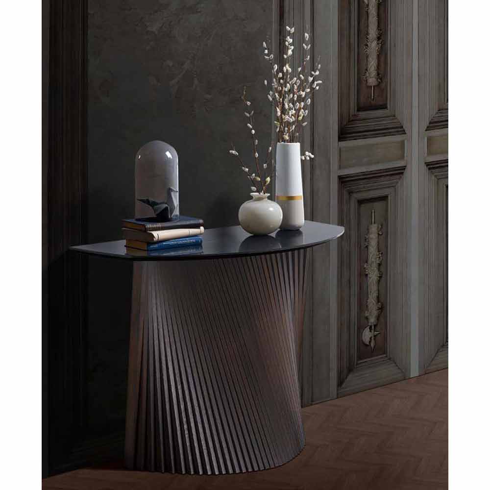Szenisch und imposant zeigt dieser Konsolentisch einen starken Charakter und eine klar definierte Persönlichkeit. Grundlegende Elemente, die es ihm ermöglichen, das Zentrum der Aufmerksamkeit zu erobern, auch dank der wunderbaren Kombination zwischen der Majestät des Holzes und der Eleganz und Raffinesse von Steinzeug und seinen Oberflächen .