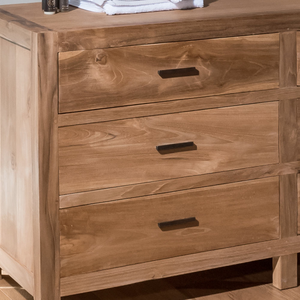 Diese Kommode aus massivem Teakholz ist ein robustes und elegantes Möbelstück, ideal, um Ihr Schlaf- oder Wohnzimmer stilvoll einzurichten. Die handwerkliche Verarbeitung und die natürliche Holzmaserung verleihen ihr eine warme und authentische Ausstrahlung, die jeden Raum aufwertet.