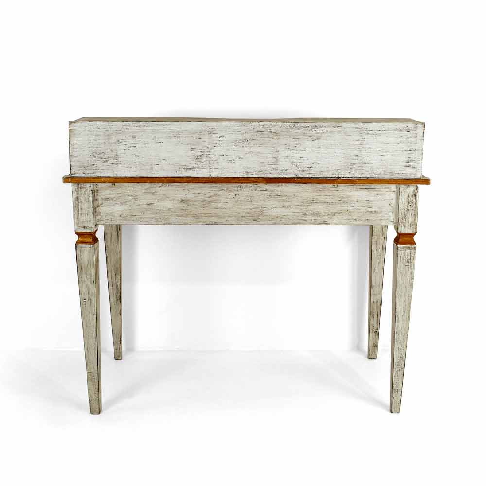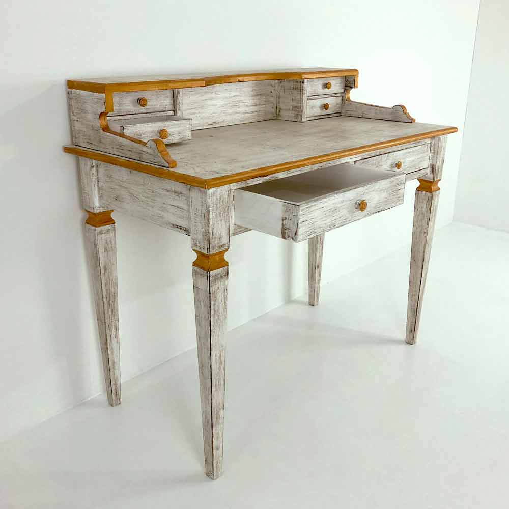 Schreibtisch handgefertigt in Italien aus massivem Tannenholz mit gealterter weißer Oberfläche, angereichert mit Profilen und Details in antikem Gold . Die Struktur verfügt außerdem über einen praktischen, leicht entfernbaren Backsplash , mit dem Sie insgesamt 6 Schubladen erhalten, die sich ideal zum Anordnen und Organisieren Ihrer Objekte eignen.