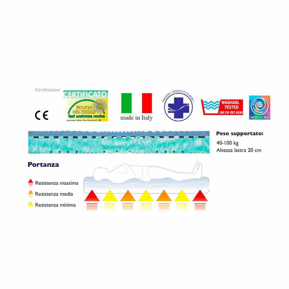 Die beste Transpiration wird auch durch das besondere Profil und die Löcher garantiert, die das Memory an die "Natura" -Schaumstoffschicht binden, die das Körpergewicht korrekt und effektiv trägt und auch im unteren Teil geformt ist, um die Verwendung dieses Produkts auf mechanisierten Netzen zu erleichtern .
