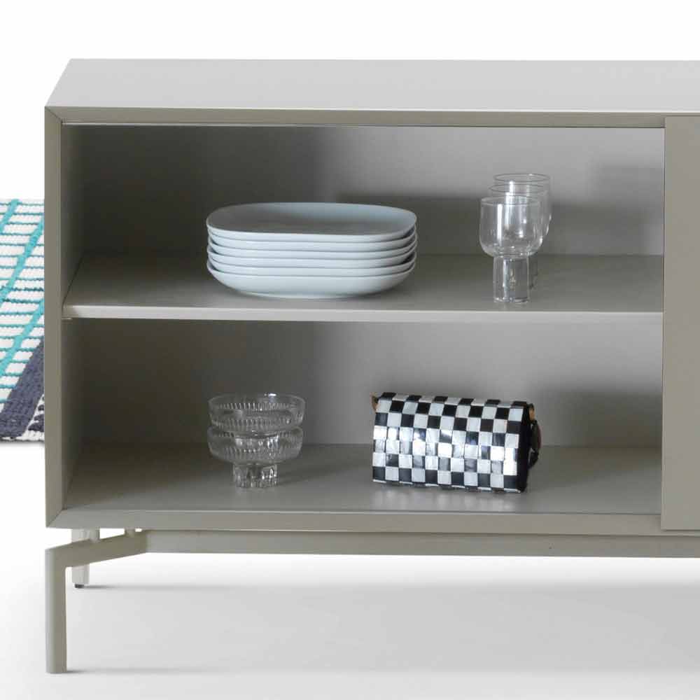 Sideboard aus matt taubengrau lackiertem MDF mit warmgrau lackiertem offenen Fach.