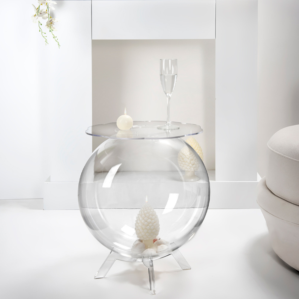 Seine kugelförmige Form, kühn und rein, verwandelt sich je nach Bedarf: heute eine elegante Vase für Ihre Blumenarrangements, morgen ein originelles Aquarium, das Ihrer Umgebung neues Leben einhaucht, oder ein praktischer Behälter für Spielzeug oder Wäsche, der diskret zur Kenntnis genommen werden kann. Seine Transparenz ist eine Einladung, Ihrer Kreativität Ausdruck zu verleihen und nach der Inspiration des Augenblicks zu füllen und zu dekorieren, ohne jemals die Umgebung zu belasten.