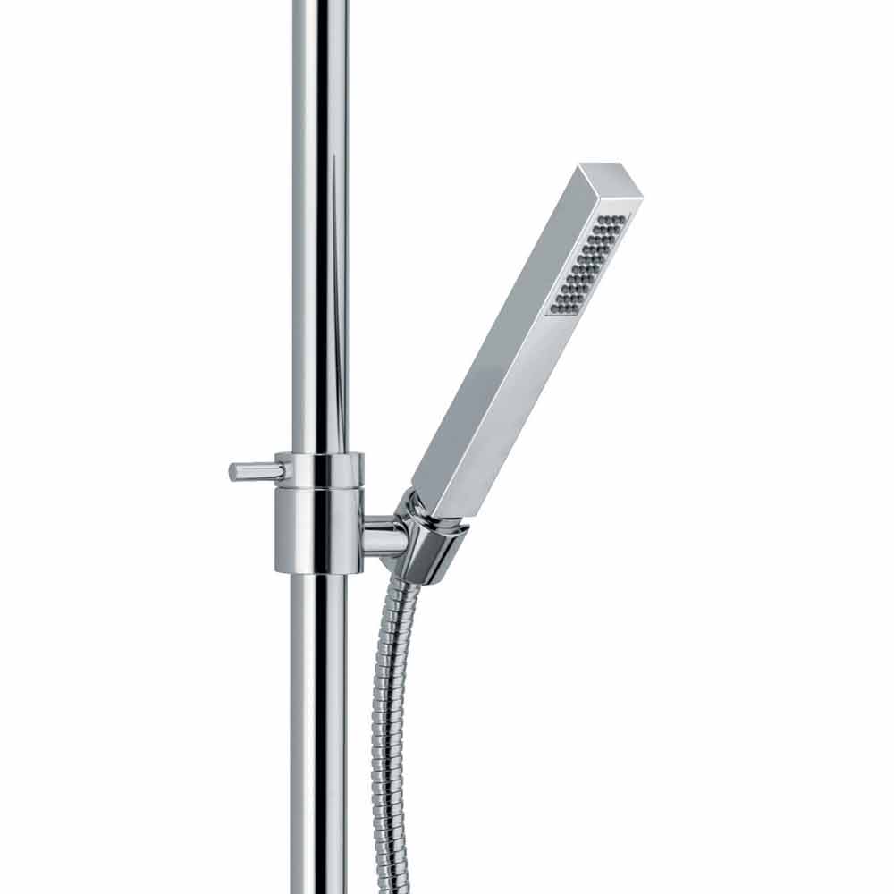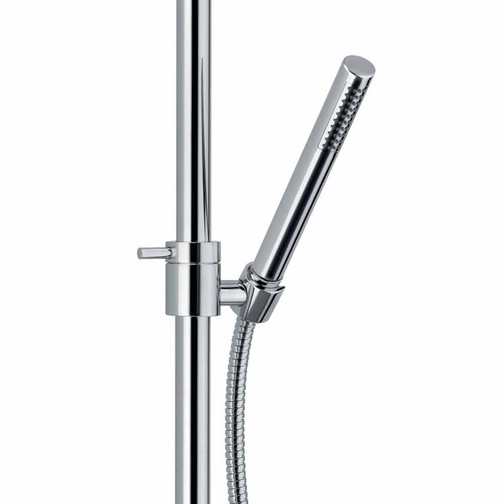 Funktionalität , wodurch eine Duschsäule erhalten wird, die so schön und raffiniert ist, wie sie praktisch und einfach zu bedienen ist. Mit der Schiebestütze können Sie die Höhe der Handbrause einstellen, mit dem 150-cm-Schlauch können Sie sie auf völlig handliche und komfortable Weise verwenden.