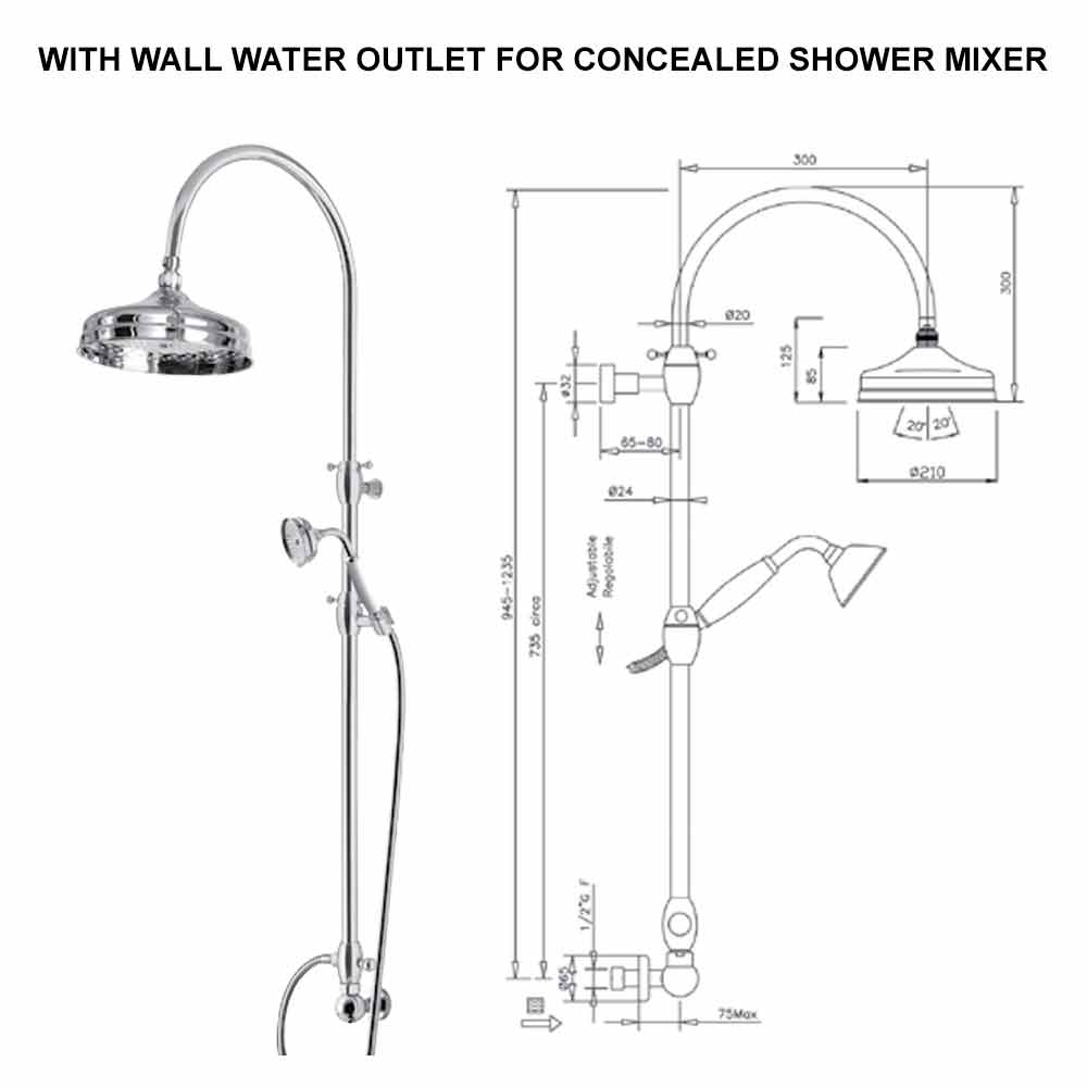 Duschsäule aus Messing mit Duschkopf und Handbrause im klassischen Design, hohe Qualität, Made in Italy.