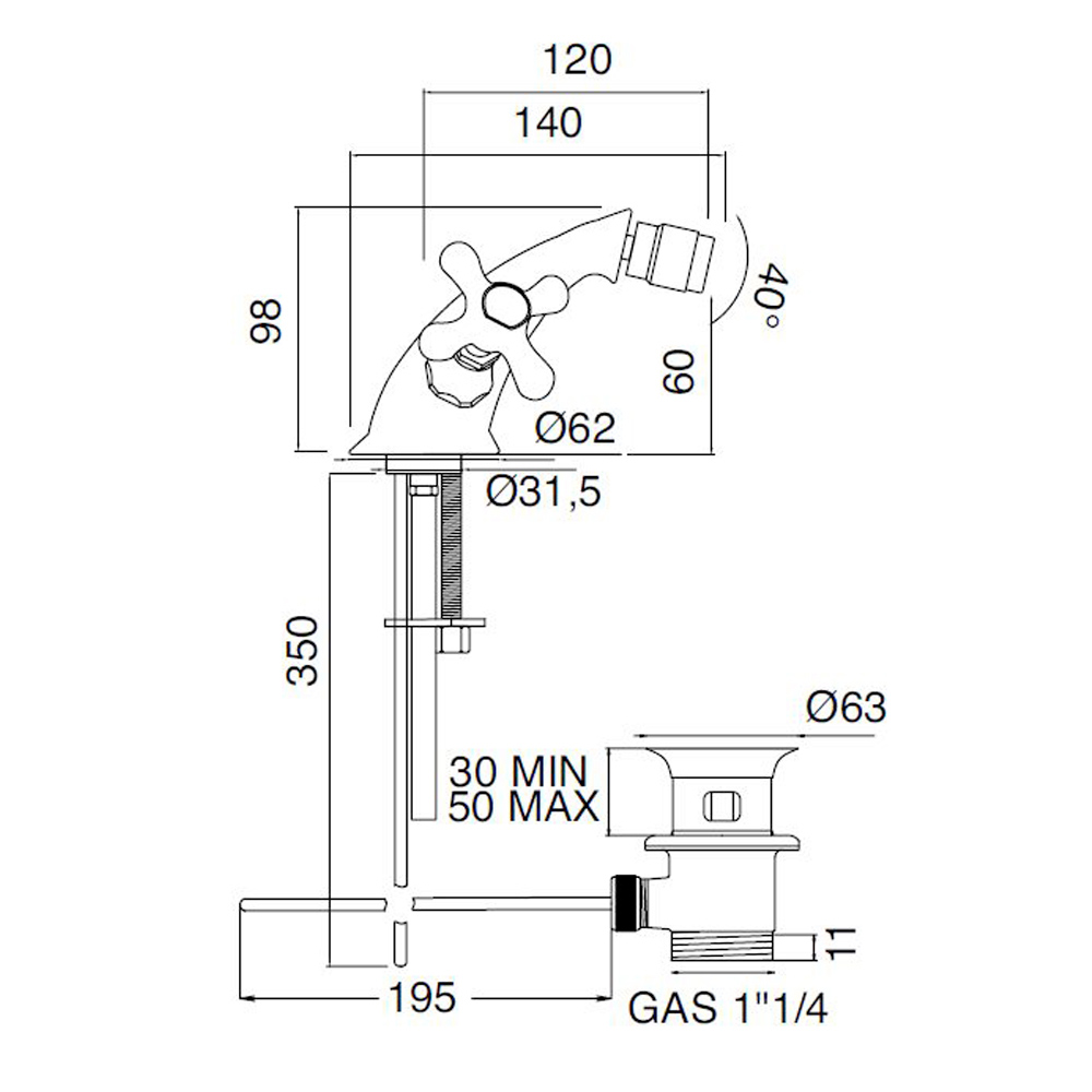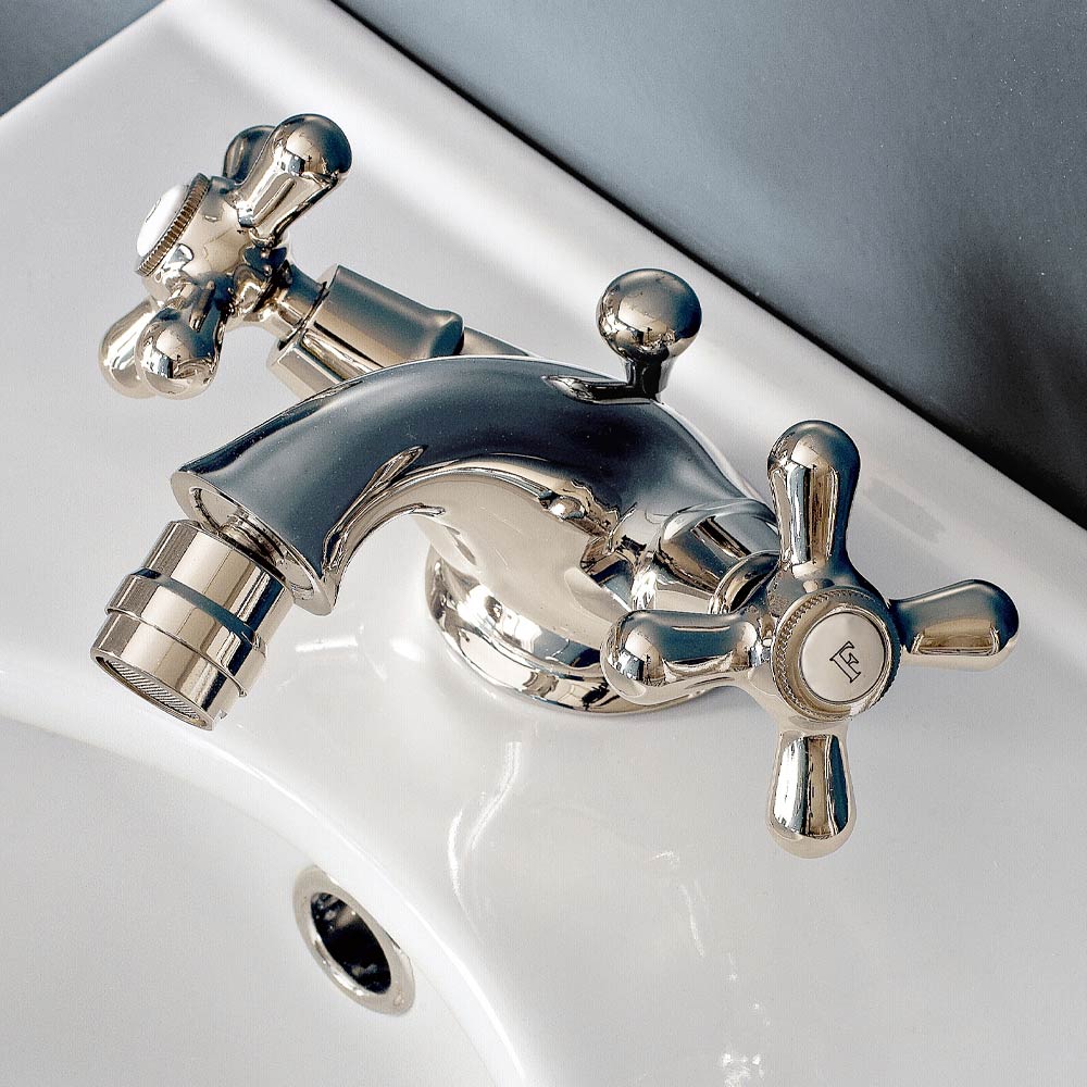 Einloch-Bidetarmatur mit handgefertigter Messingspülung made in Italy.