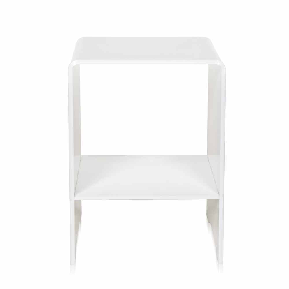 Mimi moderner Design weißer Couchtisch / Nachttisch, made in Italy Neben Ihrem Bett als praktischer Nachttisch, neben dem Sofa als Couchtisch, neben der Badewanne als Handtuchhalter und Beauty-Produkten: Vielseitige weiße 10mm starke Tischplatte, 100% reines Polymer-Plexiglas, lasergeschnitten und gefaltet bei hohen Temperaturen. Die wichtige Dicke macht die Struktur völlig selbsttragend. Die physikalisch-technischen Eigenschaften von Plexiglas (stoßfest, nicht verformbar, unveränderlich, wärmeisolierend) machen diesen Artikel zu einem praktischen und funktionellen Möbelstück, das für jede Umgebung geeignet ist. Die Helligkeit und Helligkeit werden über die Zeit konstant und unverändert beibehalten. Das PMMA Plexiglas aus reinem Polymer ist ungiftig, hypoallergen, geruchlos und antibakteriell. 100% recycelbar. Entworfen, entworfen und hergestellt in Italien, mit italienischen Materialien.