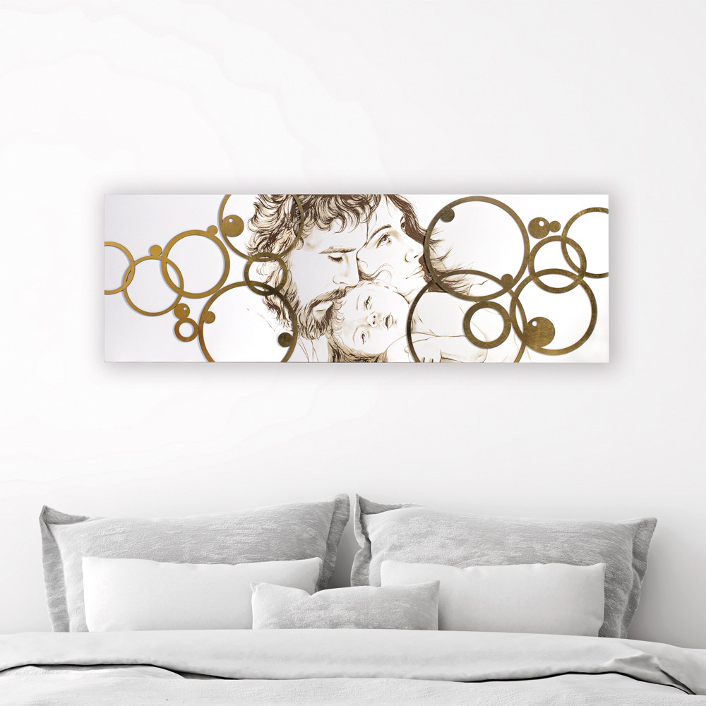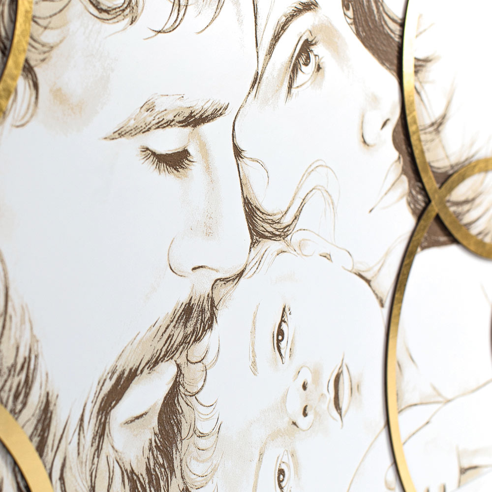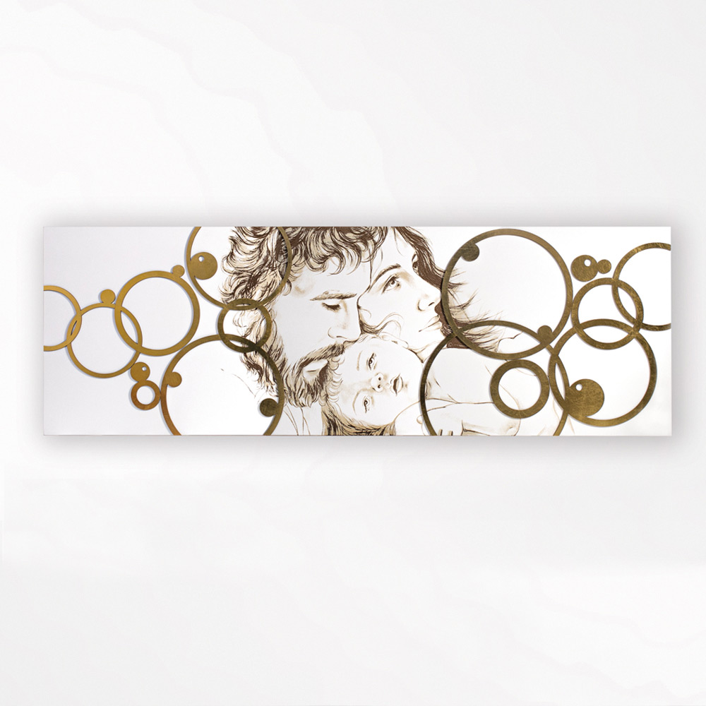 Das Panel stellt die Heilige Familie in modernem Stil dar. Auf das lasermarkierte Design werden Blattgolddekorationen aufgebracht. Mattweiß lackierte Holzplatte mit Lasermarkierung, einer speziellen Technik, die ein Flachrelief auf den Materialien erzeugt. Die Applikationen sind in Blattgold gefertigt, einer besonderen Edeltechnik.