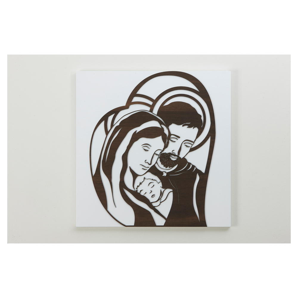 Heiliger Rahmen aus weiß lackiertem Holz mit Applikation der Gesichter der Heiligen Familie aus Wengeholz.