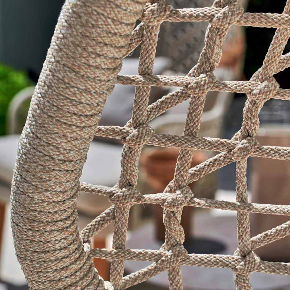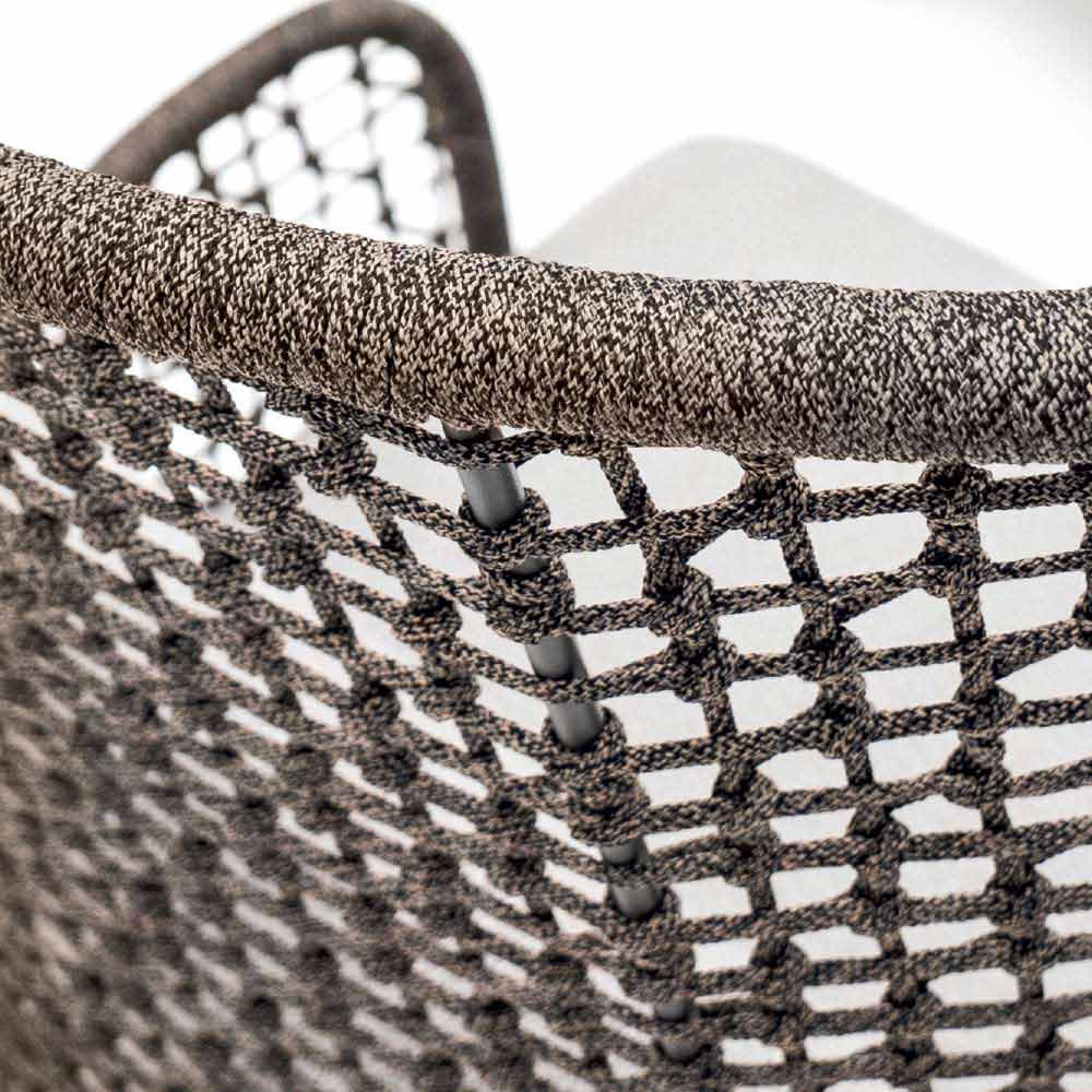 Emma ist ein fantastischer Gartensessel, der sich durch eine syntaktische Faserstruktur auszeichnet, die von Hand gewebt wird, mit einem pulverbeschichteten Aluminiumrahmen, in zwei verschieden Farben lackiert: beige oder dunkelgrau.
